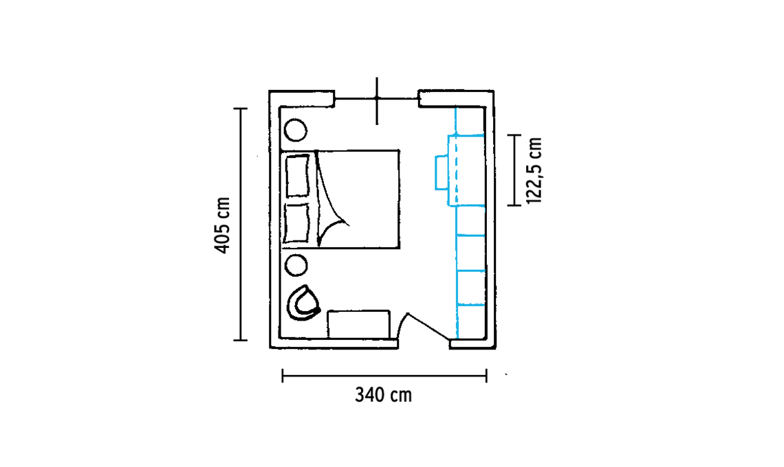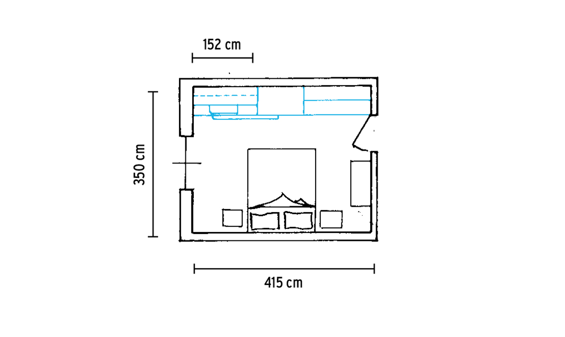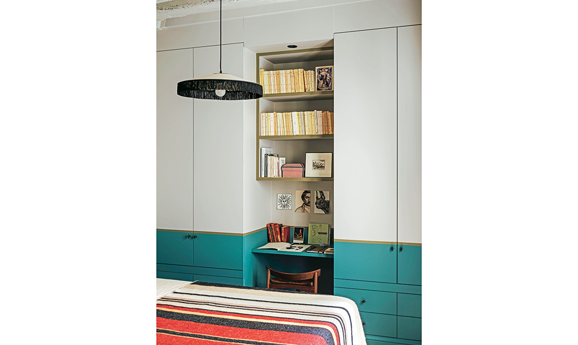 Preferisci le soluzioni su misura? Ricava l’angolo studio tra due moduli armadio, sistemandoli in modo da ricavare una nicchia che attrezzerai con piano scrivania e scaffale pensile. Il tocco dell’interior designer Marianne Evennou, che ha unito mobili e parete con una fascia di colore, è speciale! [progetto M. Evennou - foto Stephane Julliard/Tripod Agency].