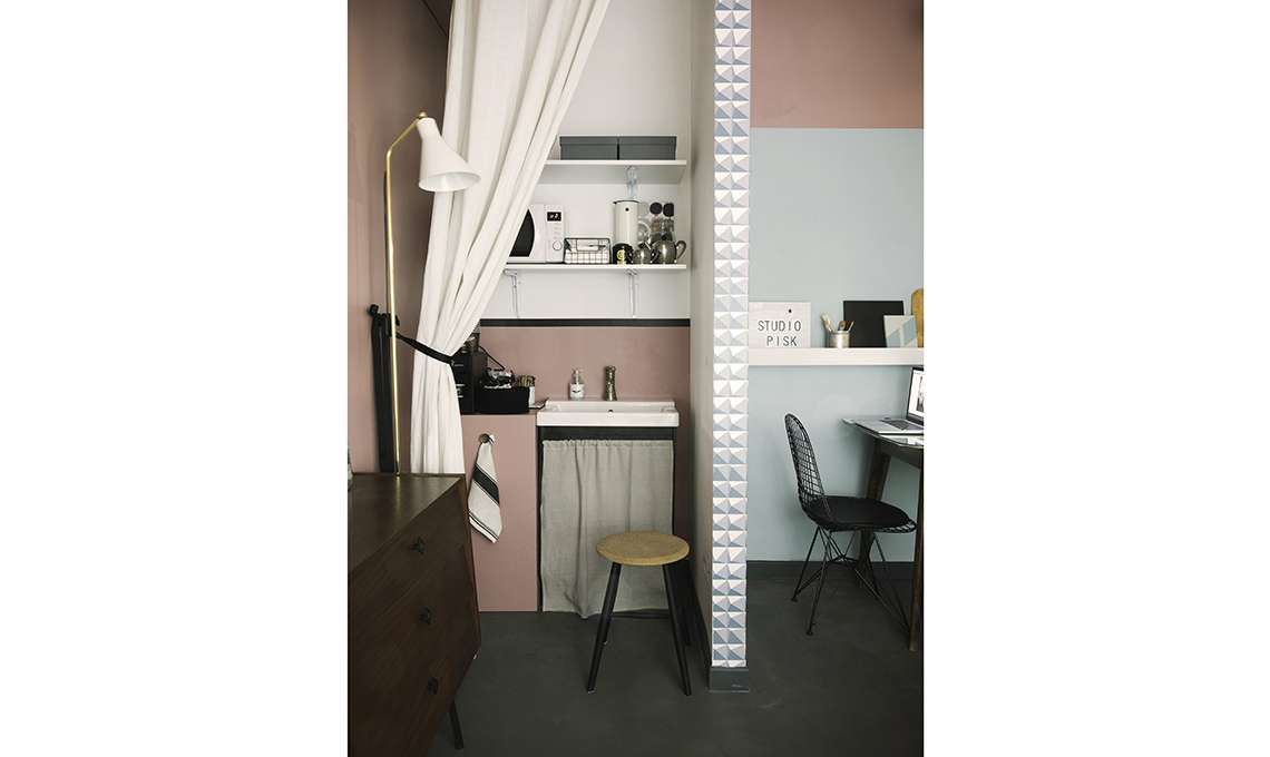 Un piccolo cucinino per la pausa caffè: è bastata una spalletta in muratura per creare due zone accostate alla stessa parete, una per la scrivania e una per la mini-cucina con lavello e angolo cottura (con forno a microonde). Un’altra soluzione che porta al lavoro le comodità di casa!