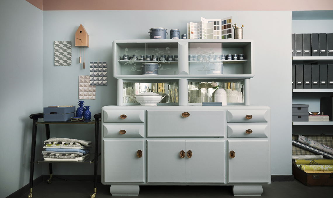 A contrasto con la credenza vintage, alla parete, tocchi contemporanei dati dall’orologio a cucù 24k, in lamiera color rame [Progetti €451] e dai mini-campioni di carta da parati della coll. Eley Kishimoto [Kirkby Design].