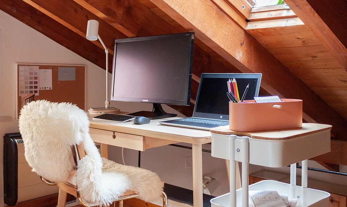 Ho organizzato un doppio spazio lavoro in casa, in due stanze separate. Nella camera da letto in mansarda, ho ricavato una piccola zona studio vicino alla finestra con la scrivania Lisabo di Ikea [cm 118x45] per i due monitor e la lampada Riggad di Ikea a ricarica wireless integrata; sulla parete di fronte ho aggiunto una bacheca in sughero per le note cartacee.