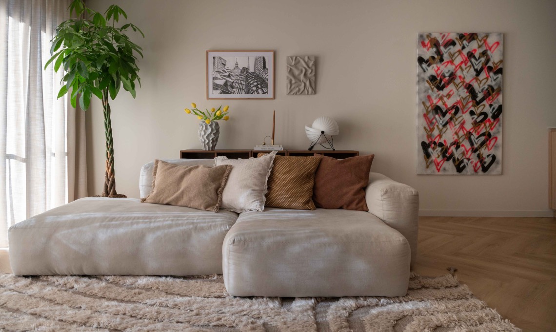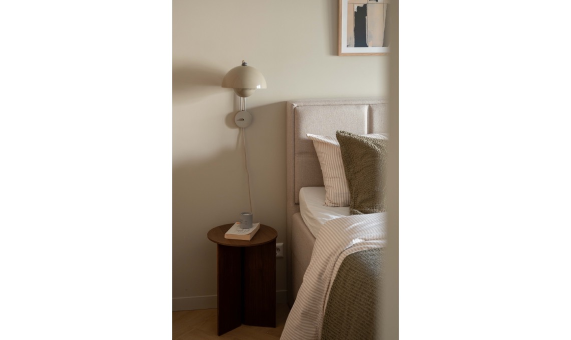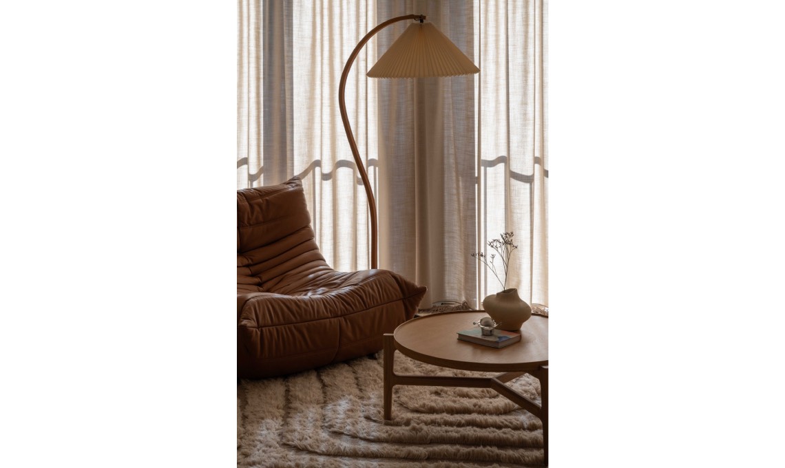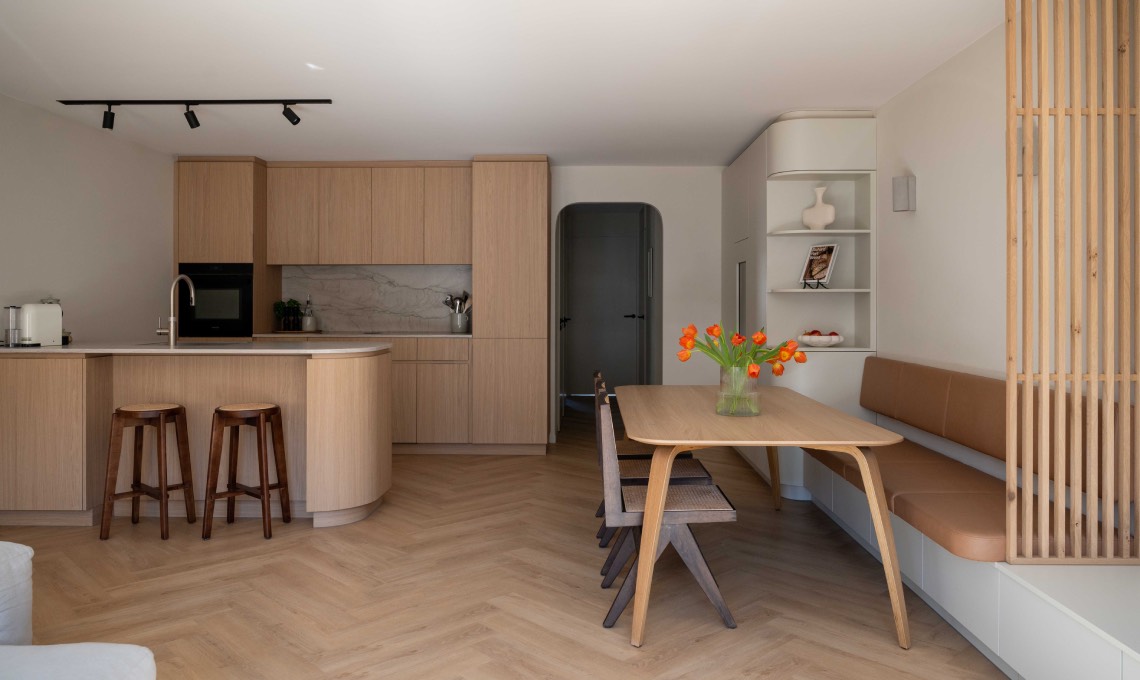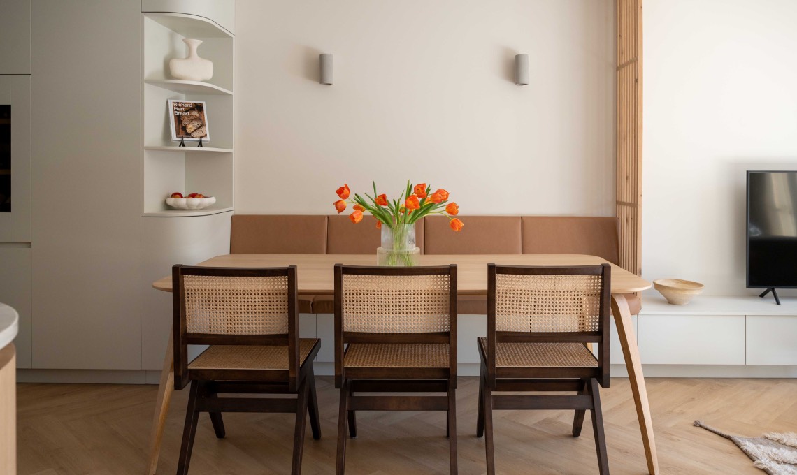 Ogni scelta, spiega l'interior designer, è stata guidata dall'idea di un'estetica essenziale ma calda, in cui forma e funzione convivono in armonia. «Lo stile è ispirato al design nordico, con linee morbide, colori neutri e materiali naturali» dice Mariarosaria. «Nella zona giorno ho scelto linee tondeggianti per la cucina, per trasmettere una sensazione di morbidezza, e materiali naturali come legno e pietra».