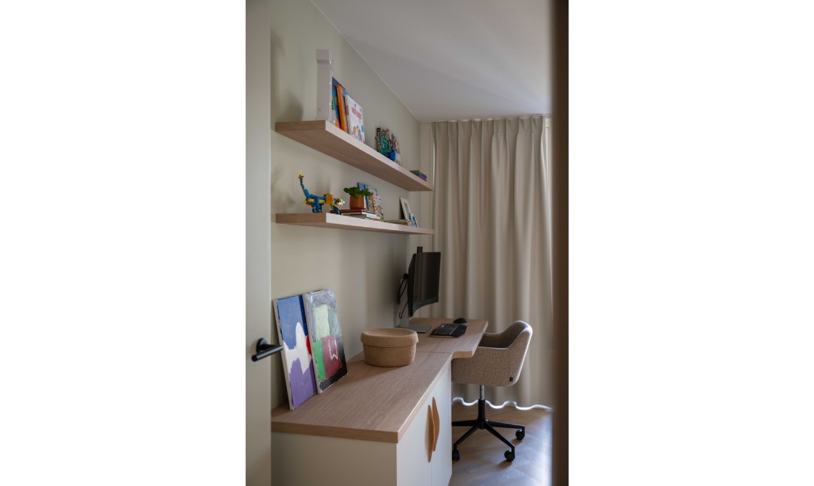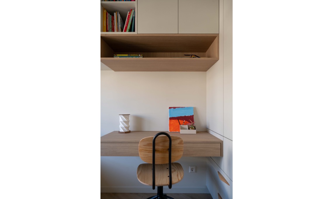 L'angolo studio è ricavato a ridosso dell'armadio e della libreria in quota. La scrivania è sospesa, per permettere l'apertura dei cassetti che completano l'armadiatura su misura.
