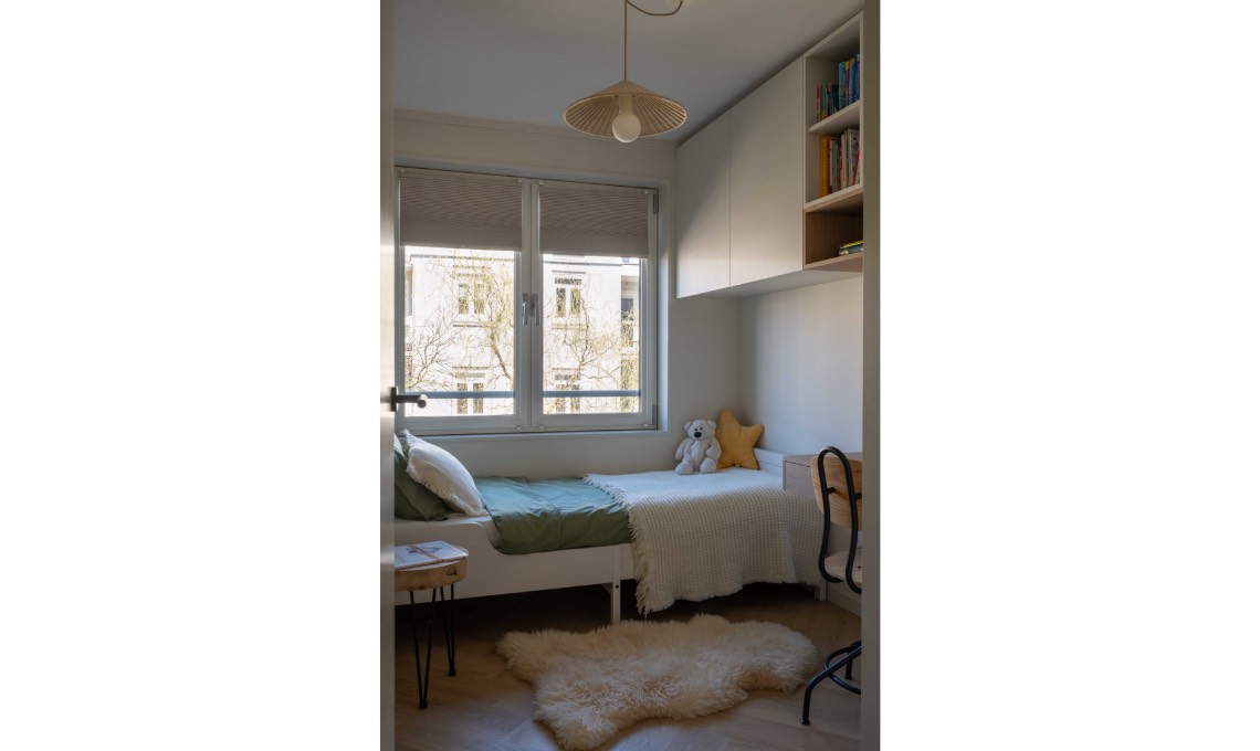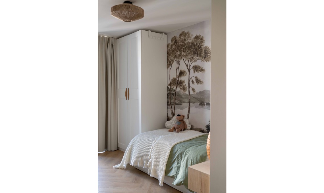Le 3 camere da letto sono state progettate per rispondere alle esigenze pratiche senza sacrificare l'estetica. «Le due stanze dei bambini, di cui una di soli 6 mq, sono state ottimizzate con storage su misura, per contenere giochi, libri, vestiti e oggetti quotidiani. Entrambe sono state decorate con carte da parati che raffigurano paesaggi di campagna e naturali, nei toni del verde, per creare un'atmosfera bucolica e rilassante, in continuità con il legame con la natura che attraversa la casa».