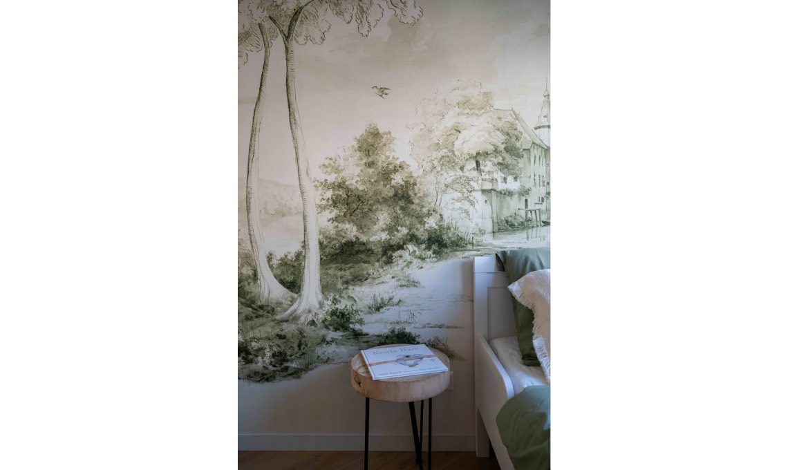 Entrambe le camerette hanno una parete rivestita con una carta da parati che raffigura paesaggi di campagna e naturali nei toni del verde, per creare un'atmosfera bucolica e rilassante. Hai notato il tavolino? Ha la base di legno grezzo con sottili gambe metalliche.