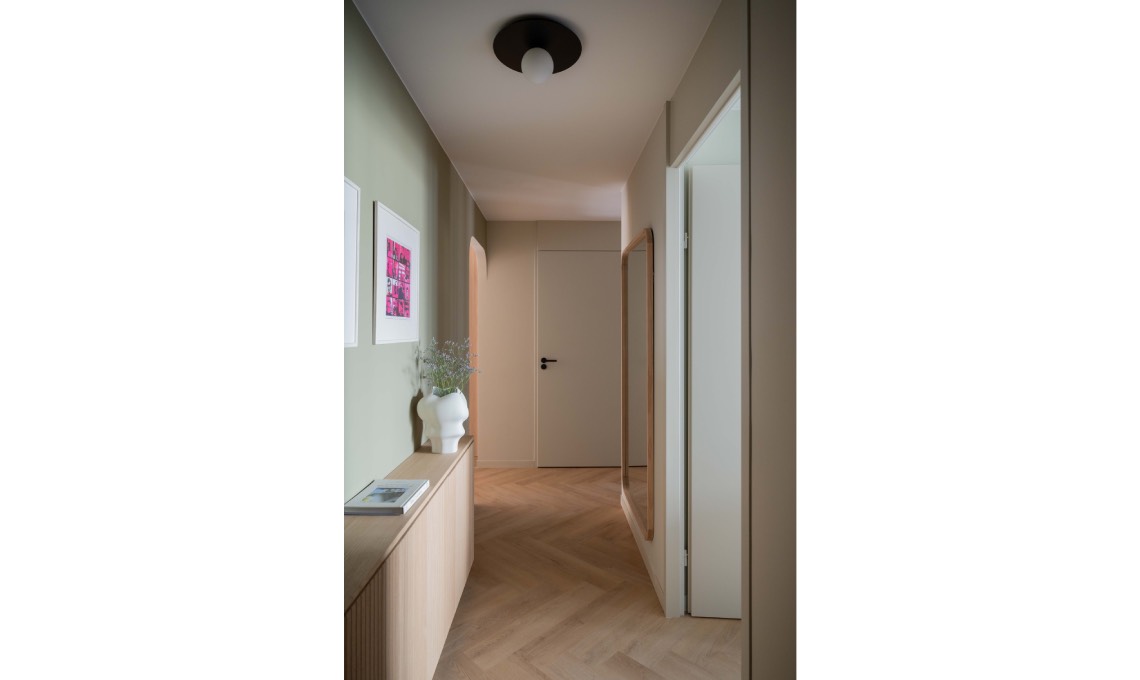 Anche il corridoio segue la purezza ed essenzialità nordica che per Mariarosaria ormai sono un tratto distintivo del suo lavoro di progettista. Niente qui è fuori posto perché tutto in casa deve dare un'idea di relax e quiete, a contrasto con il caos della città.