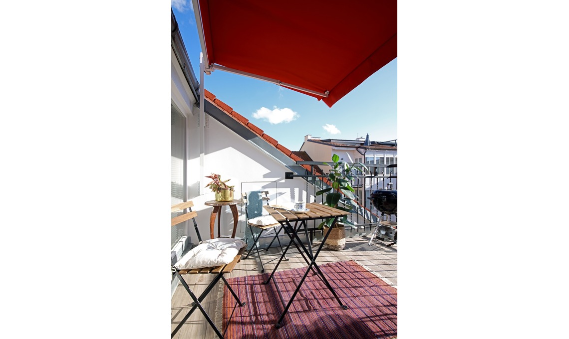 Il terrazzino è arredato con un semplice tavolo da esterno in legno e metallo, e poggia su un tappeto afghano tessuto su misura di Maimana. Una tenda da sole in tessuto porta il colore rosso anche all'esterno, riproducendo le vicine tegole in terracotta e abbinandosi al drappeggio dell'interno.