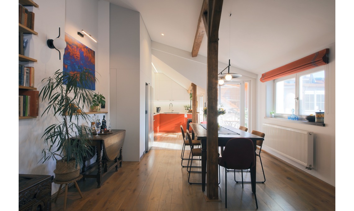 La cucina condivide una parete di vetro con il balcone, offrendo una posizione perfetta per un angolo colazione. Le travi in legno originali sono state levigate e rifinite, mentre le crepe nel legno sono state lasciate per mantenere il fascino originale. Il tavolo per la colazione è stato costruito su misura da un giovane falegname ceco: è in rovere massello e sospeso alla struttura metallica saldata. Le sedie ad altezza ridotta sono dell'azienda lituana The Chairs.