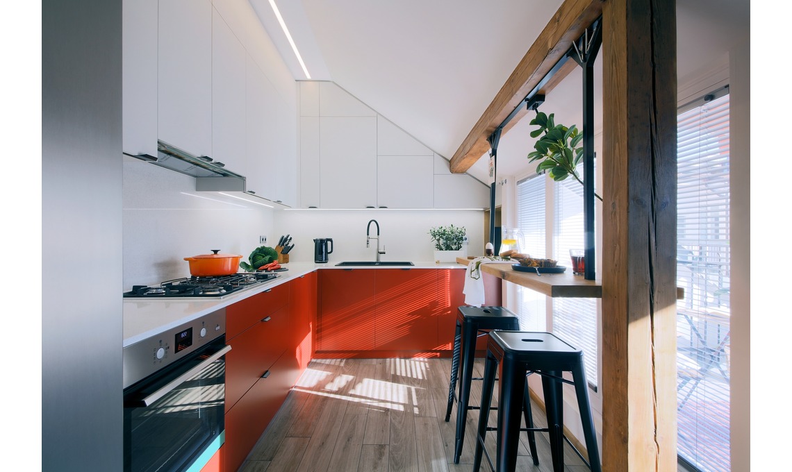 I mobili della cucina ad incasso sono stati realizzati su misura per integrarsi con le pareti e il soffitto arrivando fino a un'altezza di 3,45 m e lasciando l'attenzione visiva sui colori caldi del legno delle travi di sostegno originali, sul pavimento in rovere rifinito e sui mobili antichi. Il colore rosso inizia il suo “viaggio” con i mobili della base inferiore e continua per tutto il resto dello spazio.