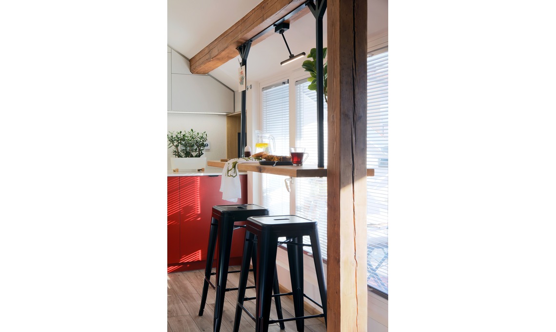 La cucina condivide una parete di vetro con il terrazzino, offrendo una posizione perfetta per un angolo colazione. Le travi in legno originali sono state levigate e rifinite, mentre le crepe nel legno sono state lasciate per mantenere il fascino originale. Il tavolo snack è stato costruito su misura da un giovane falegname ceco: è in rovere massello e sospeso alla struttura metallica saldata. Le sedie ad altezza ridotta sono dell'azienda lituana The Chairs.