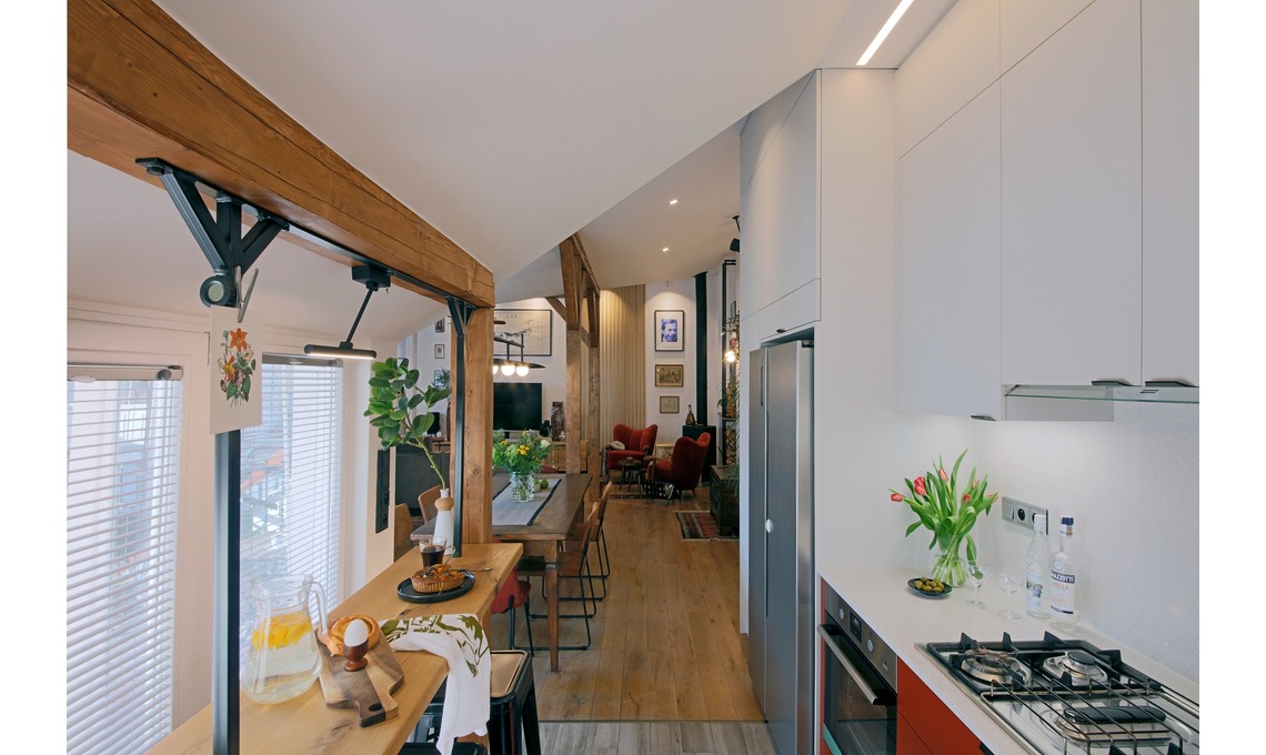 I mobili della cucina ad incasso sono stati realizzati su misura per integrarsi con le pareti e il soffitto, arrivando fino a un'altezza di 3,45 m e lasciando l'attenzione visiva sui colori caldi del legno delle travi di sostegno originali, sul pavimento in rovere rifinito e sui mobili antichi. Il colore rosso, la nota d'accento cromatica, inizia il suo “viaggio” con i mobili della base della cucina.