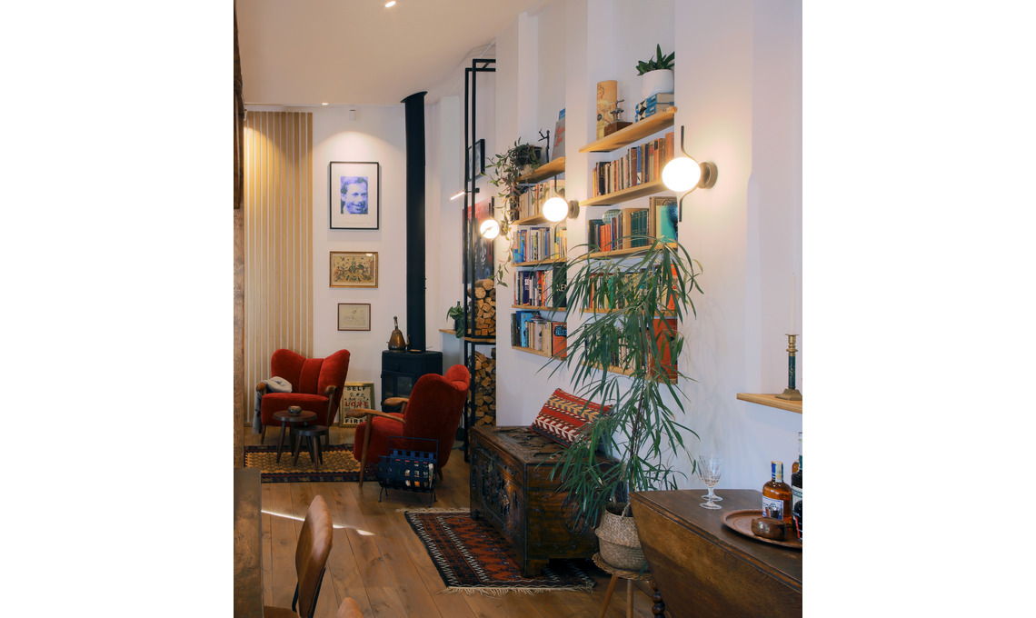 Le nicchie poco profonde originali sono state trasformate in una parete d'accento lunga 6 metri che ospita tre zone funzionali. Con: un tavolo da cocktail con ribalte nella zona pranzo, una libreria con al centro una cassapanca antica, una zona conversazione vicino alla stufa a legna sul fondo.