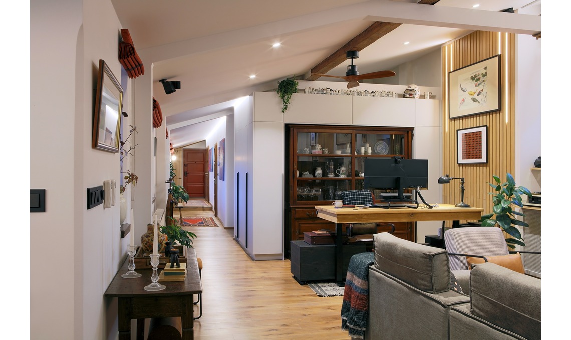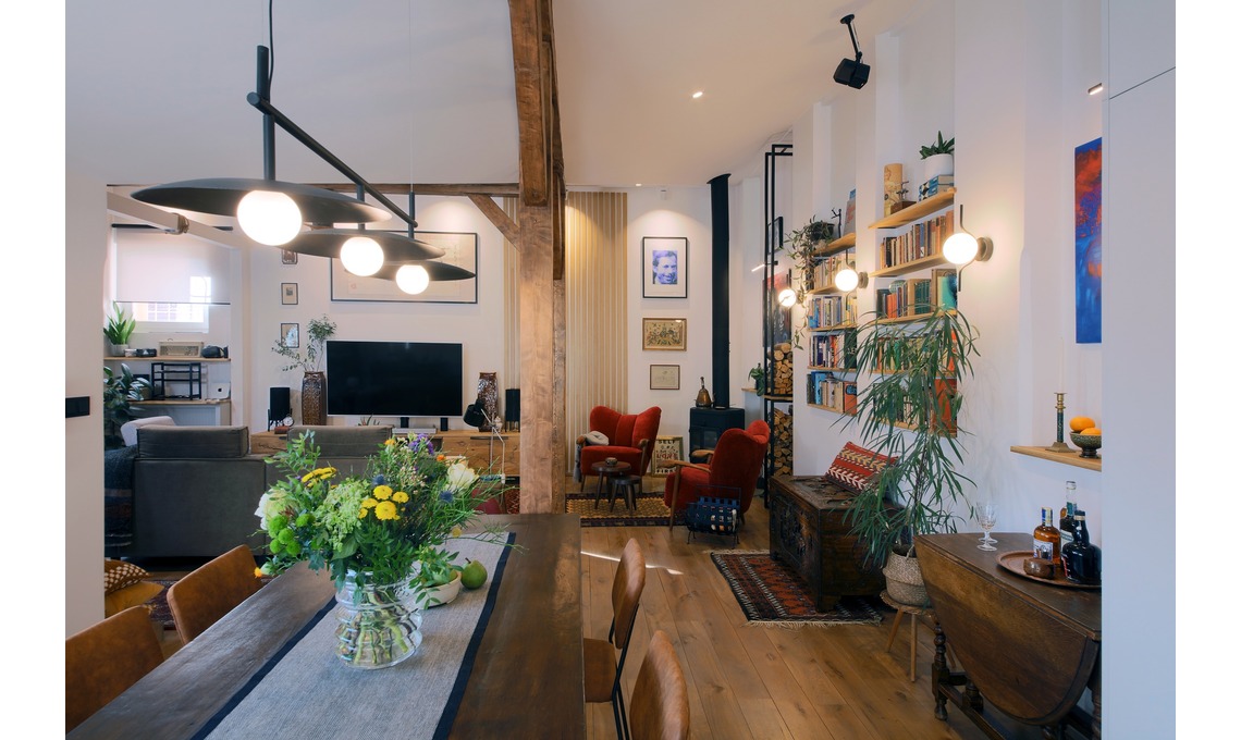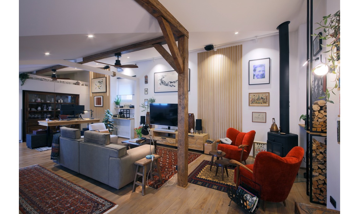 «Ho deciso di mescolare elementi moderni nel design storico, aggiungendo all'arredo eleganti mobili in laminato che si fondono con l'architettura della cucina, della camera da letto e del bagno. Ho lasciato lo spazio principale per mobili su misura come un tavolo da bar sospeso in legno di quercia, librerie di nicchia, un deposito per la legna, doghe in legno sulle pareti e una scrivania e una console tv personalizzate».