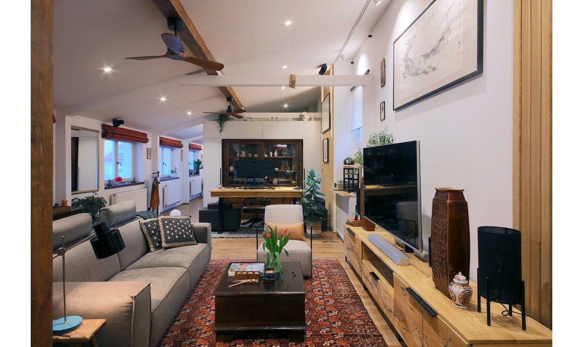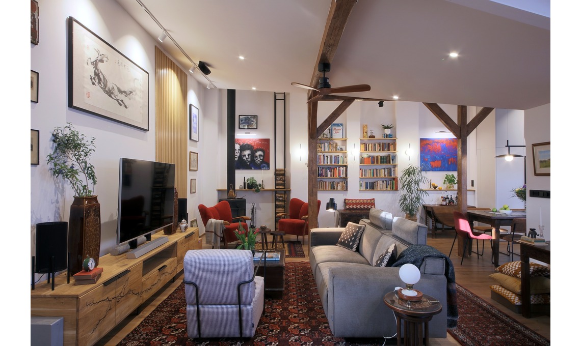 L'open space è suddiviso in zone grazie all'utilizzo di tappeti antichi di varie dimensioni, mentre l'originale trave verticale in legno contribuisce a dividere la zona tv dall'angolo conversazione davanti al camino. Sulla parete di 8x3,5m è esposta la collezione d'arte del proprietario. Il divano – realizzato su misura dal brand svedese Furninova – è affiancato da uno sgabello e da una lampada da tavolo vintage acquistata in un mercatino delle pulci ceco.