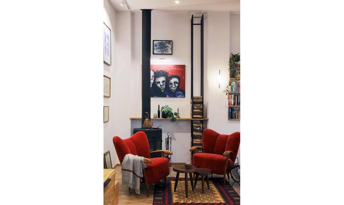 Nella nicchia angolare della parete, una stufa a legna funzionante è affiancata da due poltrone antiche scoperte in un mercato dell'antiquariato ceco, restaurate (le molle interne e la schiuma sono state rinforzate e cambiate) e rivestite in velluto rosso.