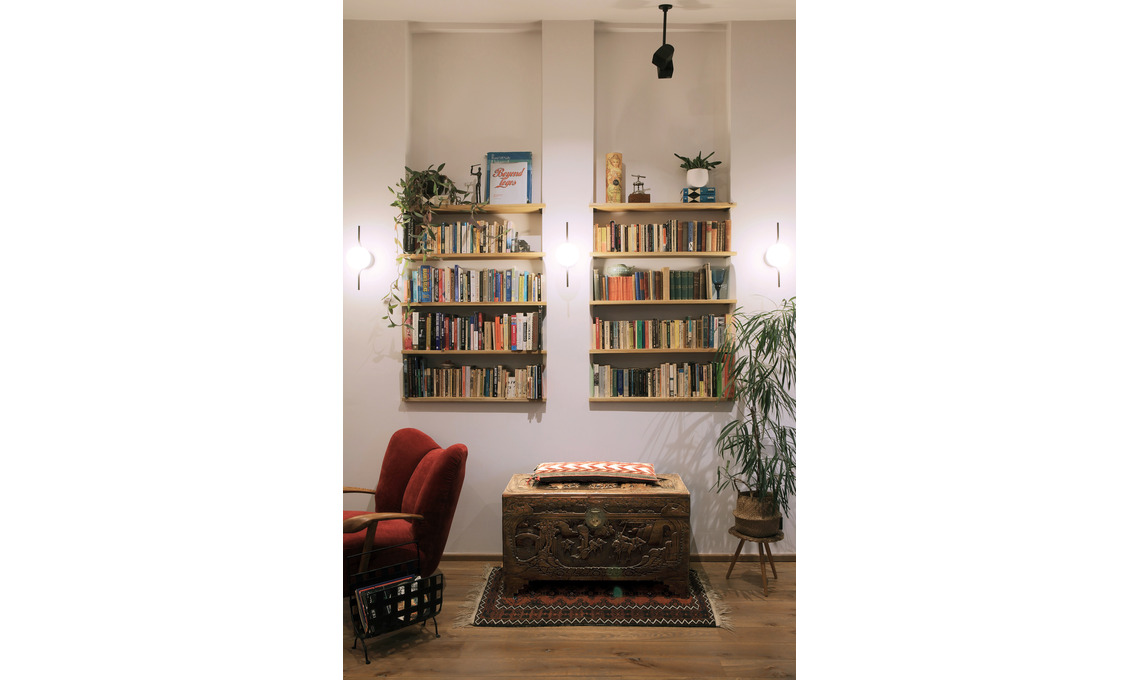 Le librerie sono realizzate su misura in massello di rovere e inserite in nicchie poco profonde nelle pareti. Le applique da parete provengono dall'azienda di illuminazione Faro con sede a Barcellona. Sullo sfondo è appeso il ritratto del primo presidente ceco Vaclav Havel, acquistato ad un'asta di beneficenza. Si tratta di un pezzo originale di David Strauzz, i cui murales adornano diversi edifici di Praga. Sotto questa immagine ci sono stampe in edizione limitata di Josef Lada.