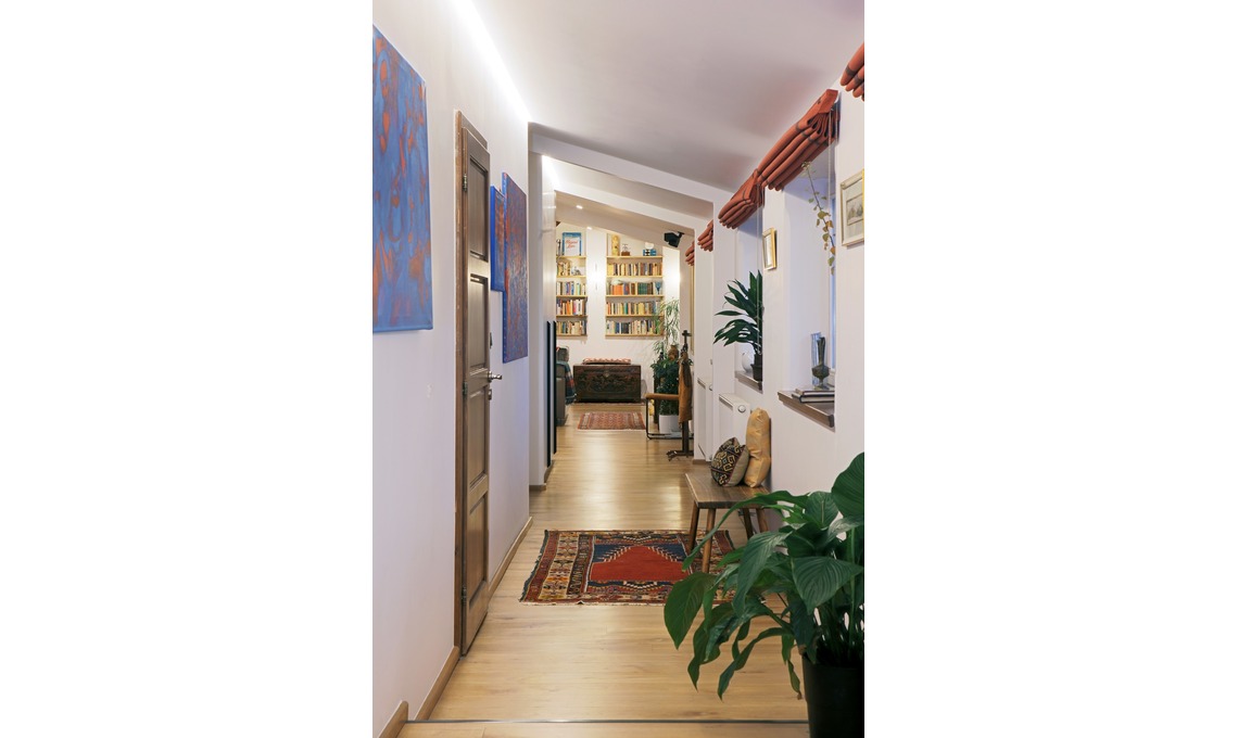 La porta d'ingresso era originariamente verde ed è stata rifinita in rosso con la nuova combinazione di colori. Le scarpiere, così come le doghe a parete e a soffitto, sono realizzate su misura in laminato di rovere con luci a Led integrate.