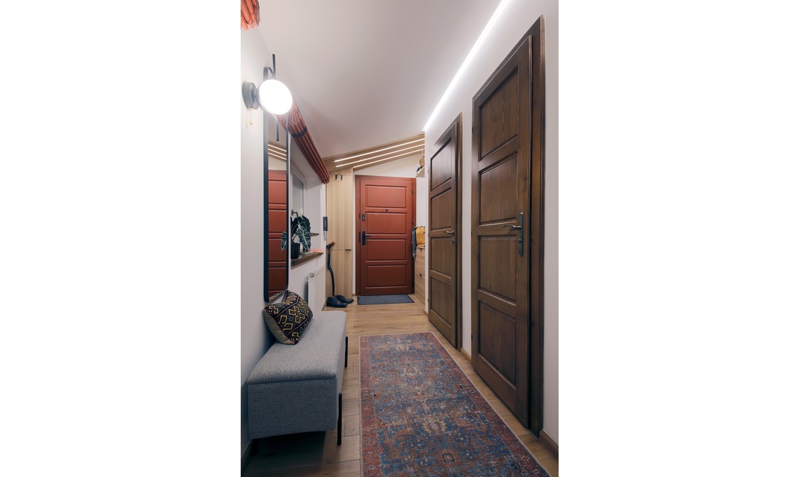 La porta d'ingresso era originariamente verde ed è stata rifinita in rosso con la nuova combinazione di colori. Le scarpiere, così come le doghe a parete e a soffitto, sono realizzate su misura in laminato di rovere con luci a LED integrate.