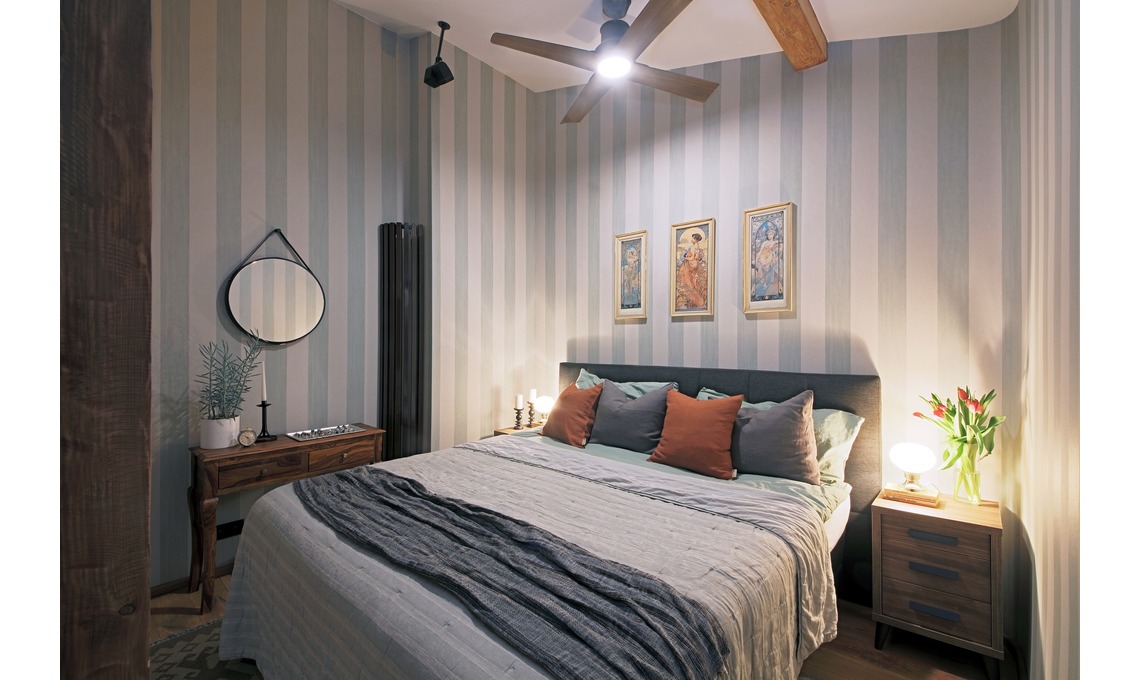 La piccola camera da letto ha una pianta irregolare, con un angolo rotondo, travi in legno, un lucernario, un soffitto inclinato e la porta d'ingresso adiacente al bagno principale. Anche in questo caso, è stata una sfida inserire tutti i mobili rendendoli accoglienti. È stata scelta una carta da parati a strisce larghe per unire visivamente la stanza e distrarre dai diversi elementi architettonici. I comodini sono realizzati su misura da un'azienda di ebanisteria locale.