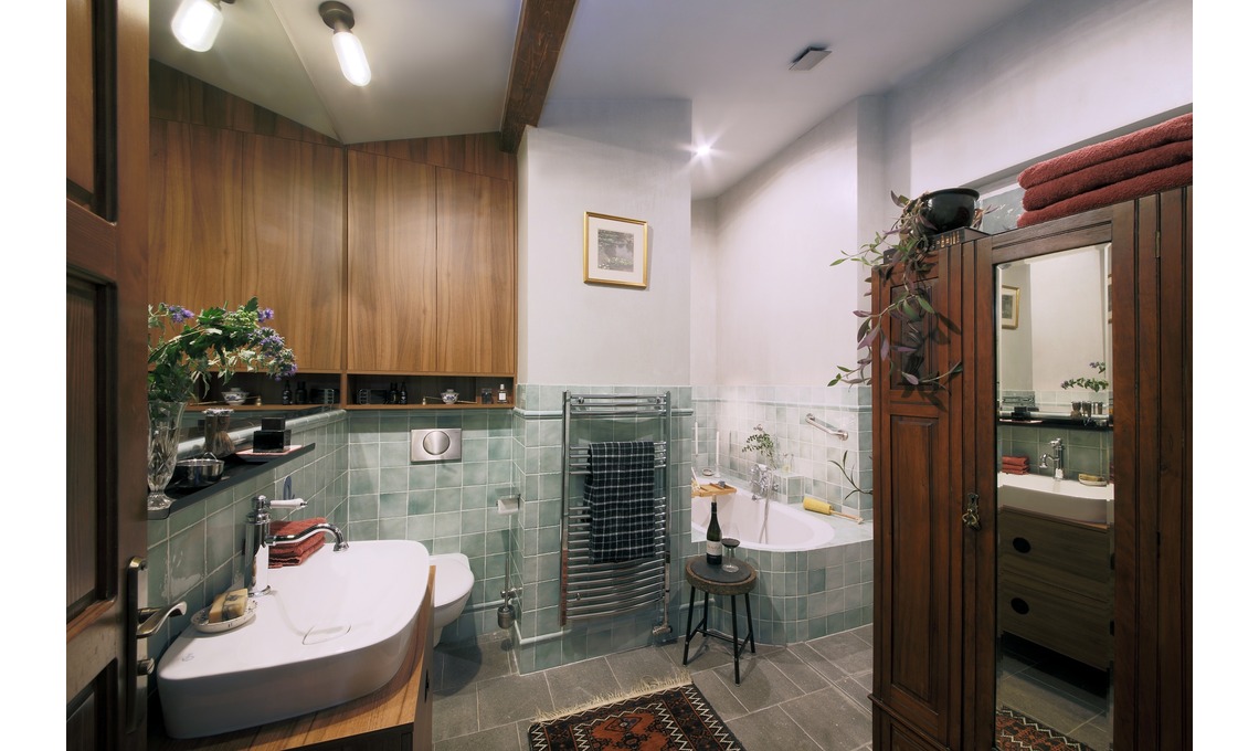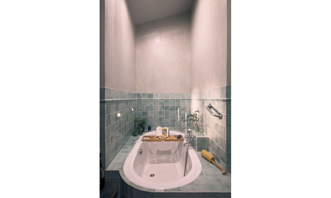 Le piastrelle verdi richiamano la carta da parati a strisce verdi dell'adiacente camera da letto principale, mentre le pareti e il soffitto sono rifiniti con intonaco decorativo (imitando la struttura del cemento), creando così un'atmosfera da spa ma con un tocco maschile enfatizzata anche dalla vasca da bagno incassata.