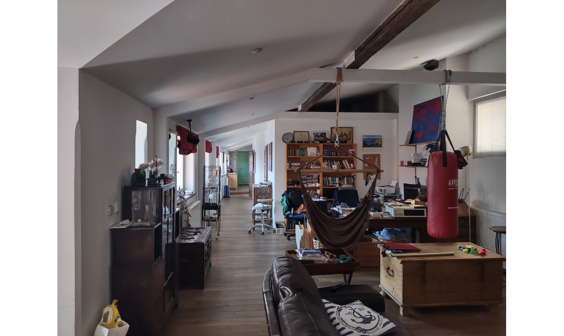 La zona office è arredata con mobili per ufficio integrati in una trave metallica esistente. Il fulcro è un antico mobile cinese portato dai Paesi Bassi che espone la collezione di porcellane e cimeli del proprietario. La scrivania in rovere massiccio è stata realizzata su misura dallo stesso giovane falegname ceco, con gambe in metallo regolabili in altezza. Il tappeto berbero tessuto a mano sotto la scrivania è di Maimana.