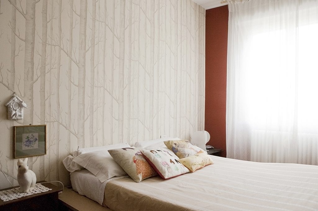 In camera da letto è un mix di delicatezze con la carta da parati [Woods di Cole&Sons] che si specchia nell'armadio.