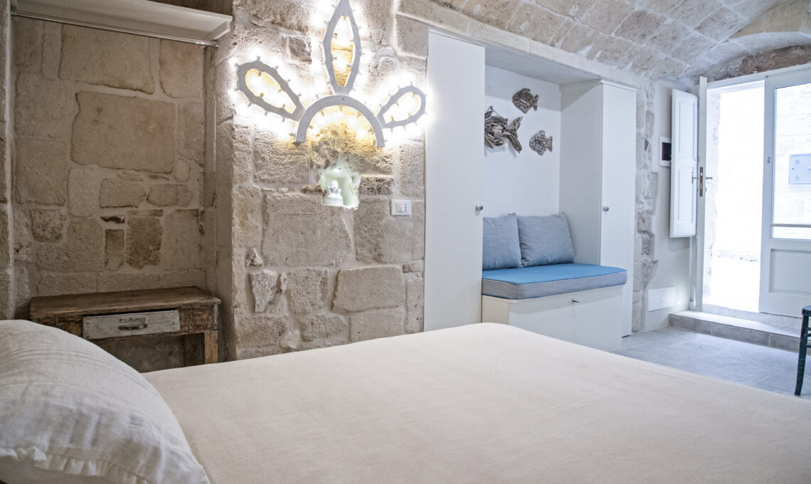 Tipiche della Puglia sono anche le luminarie che qui sono state trasformate in una originale testiera per il letto e in lampada da parete.