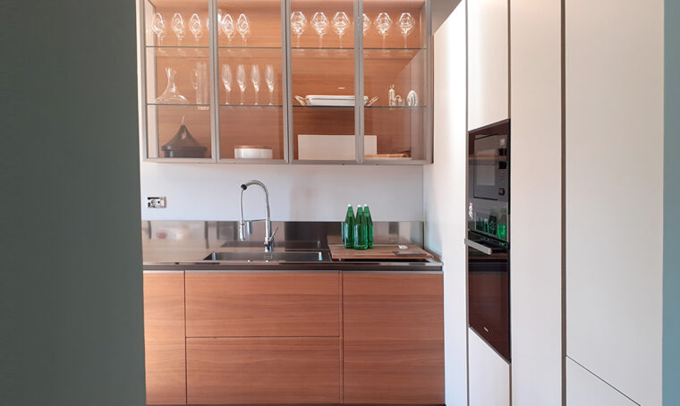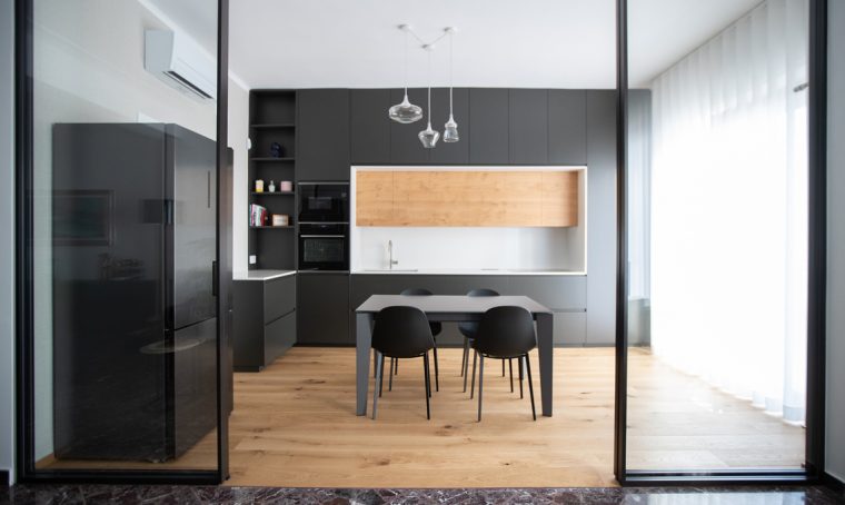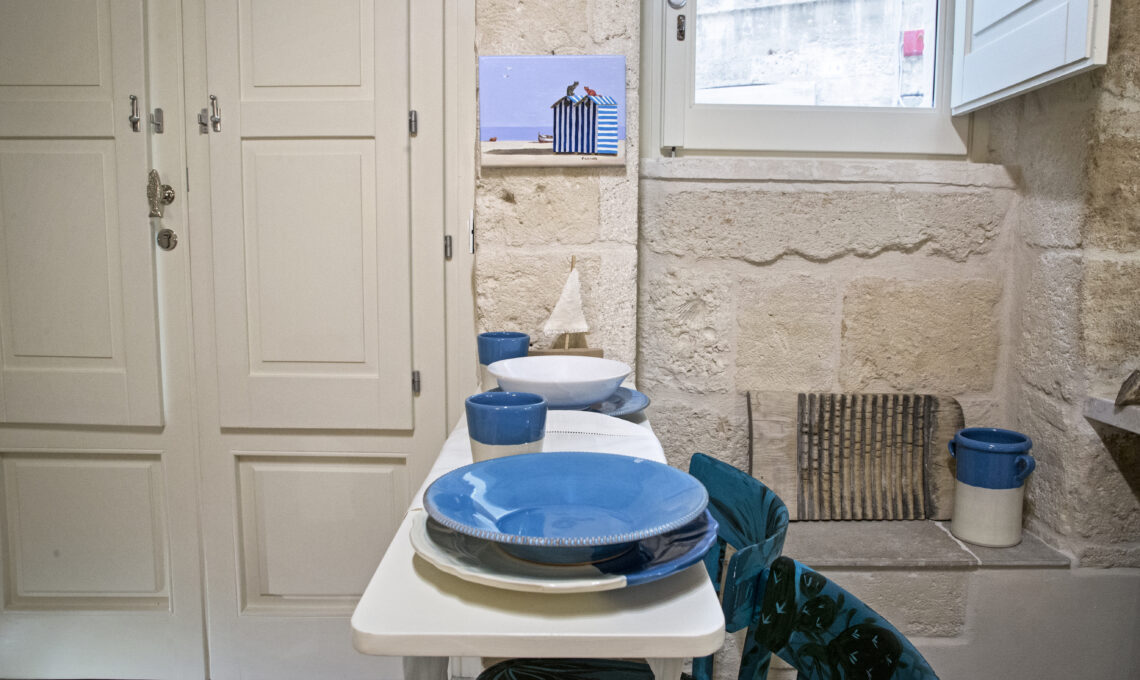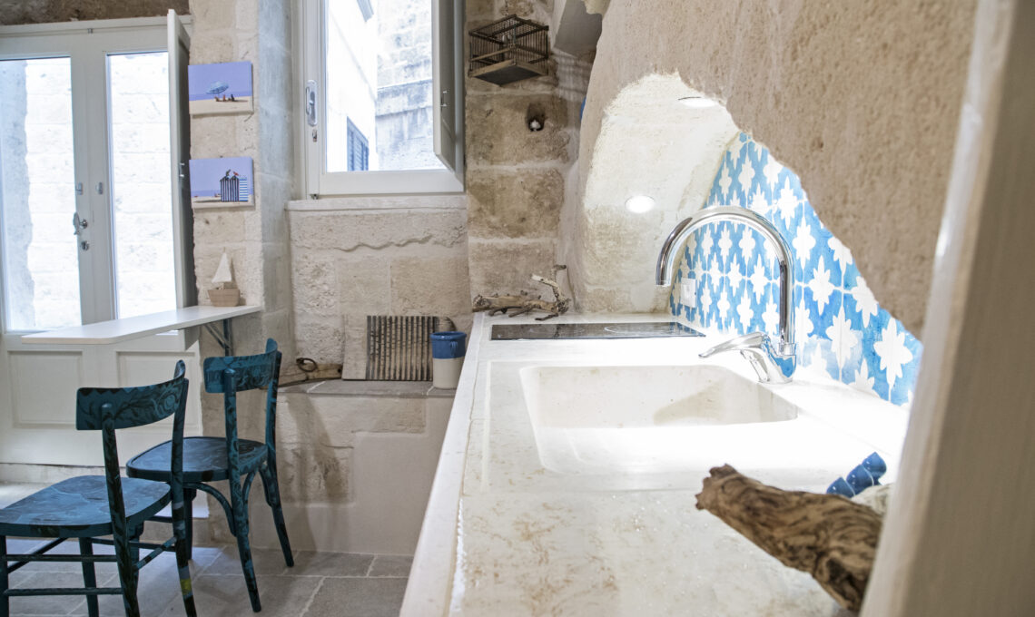 L’angolo cottura, ricavato all’interno di una volta, è composto da un piano cucina di pietra di Trani color grano dorato spazzolato opaco rivestito di piastrelle. Su idea della proprietaria di casa, i Pumi pugliesi, noti per allontanare la sfortuna e propiziare prosperità e fecondità, sono dipinti color turchese da un artigiano di Grottaglie ed utilizzati come pomelli per gli sportelli della cucina.