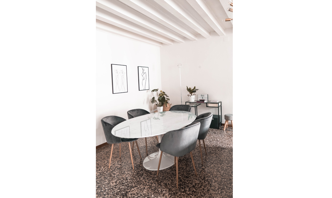 Così il pavimento originale in seminato incontra i divani moderni in velluto grigio, l'iconico tavolo da pranzo in marmo Tulip e il tappeto berbero. Elementi ben mixati che creano un ambiente moderno e rilassante.