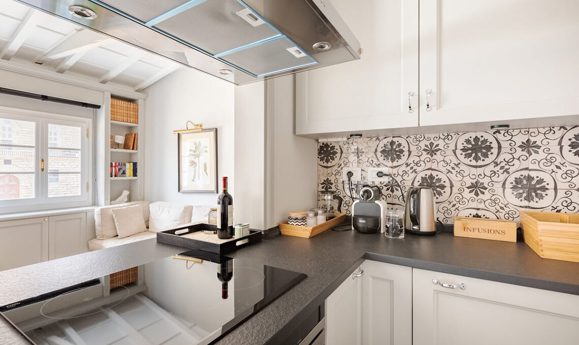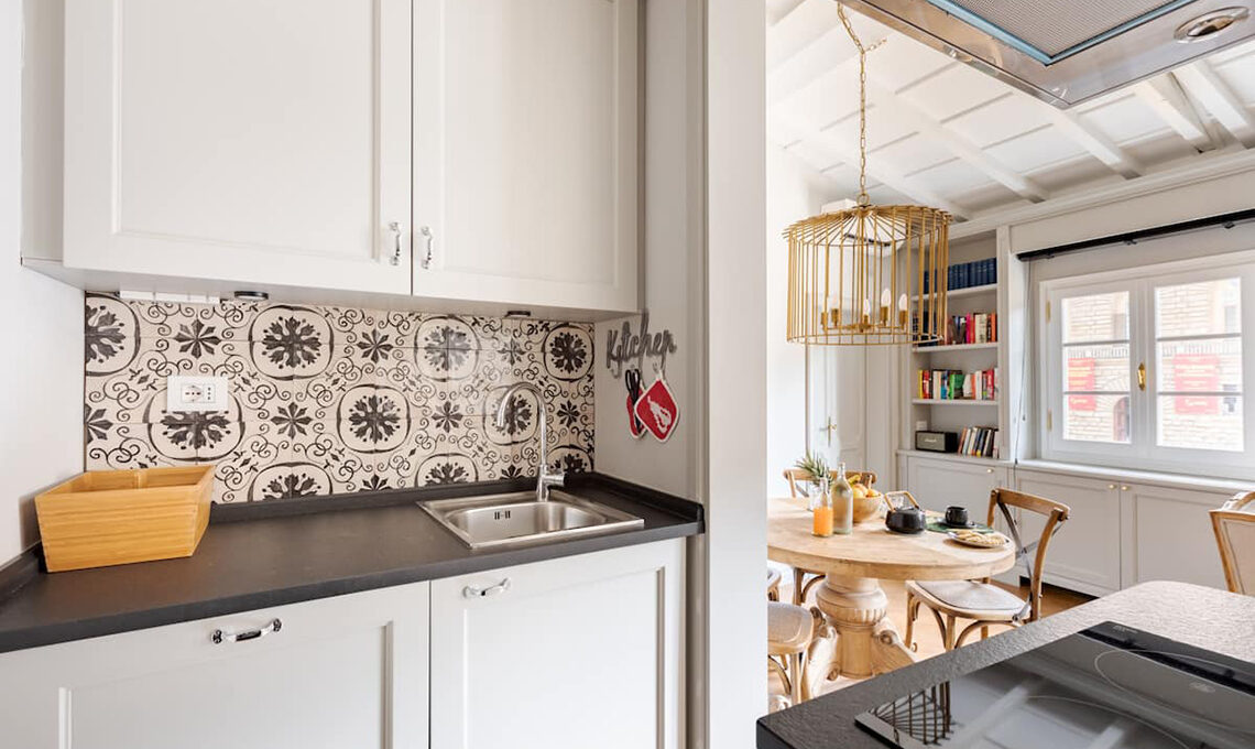 "Ora l’accesso al soggiorno si trova accanto alla porta di ingresso dell’appartamento. Siamo quindi riusciti a creare il delizioso angolo cucina, caratterizzato da uniche piastrelle decorate a mano, nella stessa zona del salotto/sala da pranzo sfruttando lo spazio rialzato della vecchia entrata del salotto".