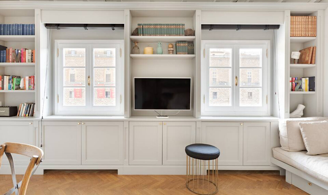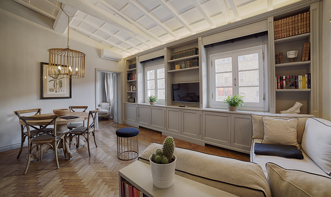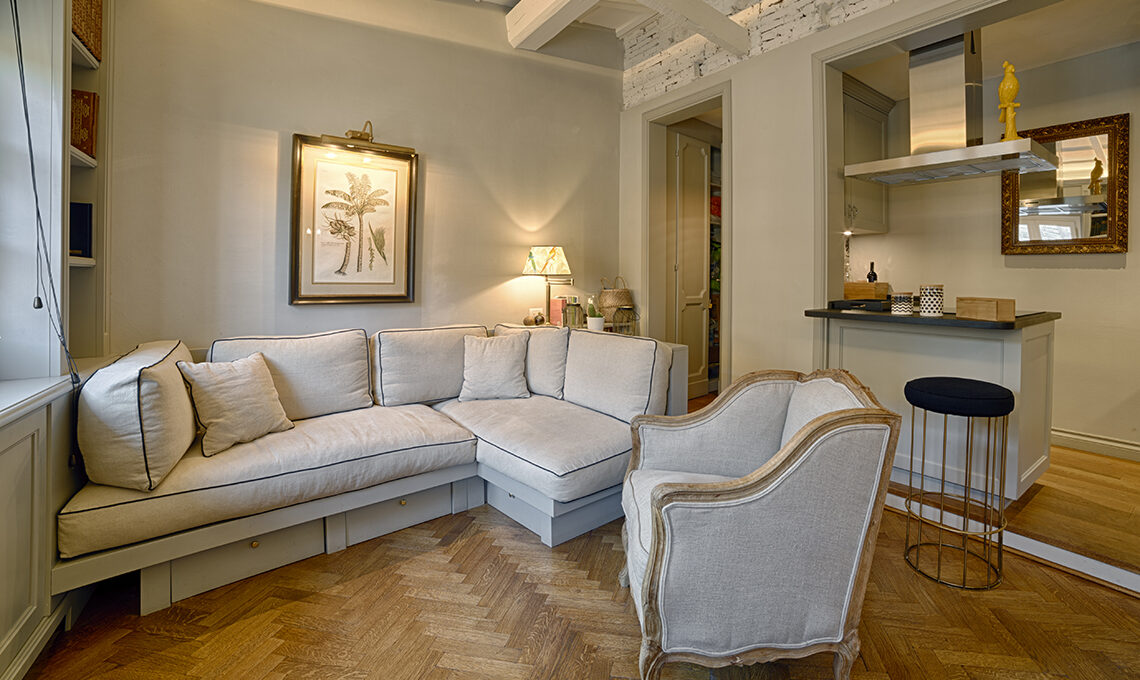 Il salotto è stato arredato con molti arredi su misura e cercando una fusione tra elementi della tradizione toscana (come la boiserie che incornicia le finestre su Piazza Pitti come fossero quadri) con elementi moderni.