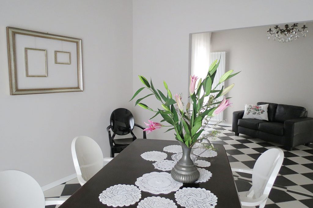 Monica ha giocato con un pavimento optical che fa da protagonista con arredi in bianco e nero.