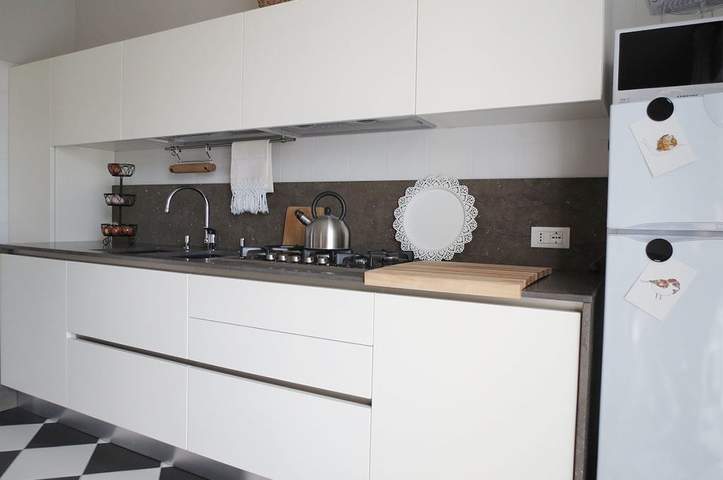 Monica ha abbinato arredi moderni lineari ad altri di recupero dalle forme più curve ma perfettamente integrati anche grazie alla mano di bianco.