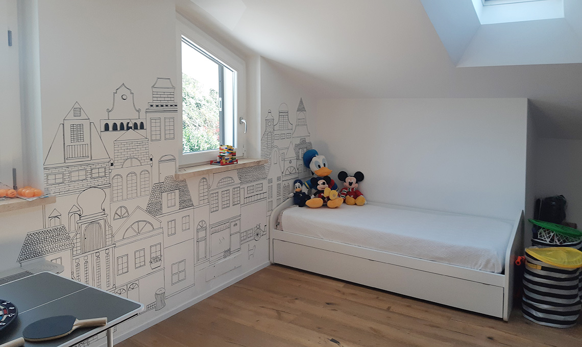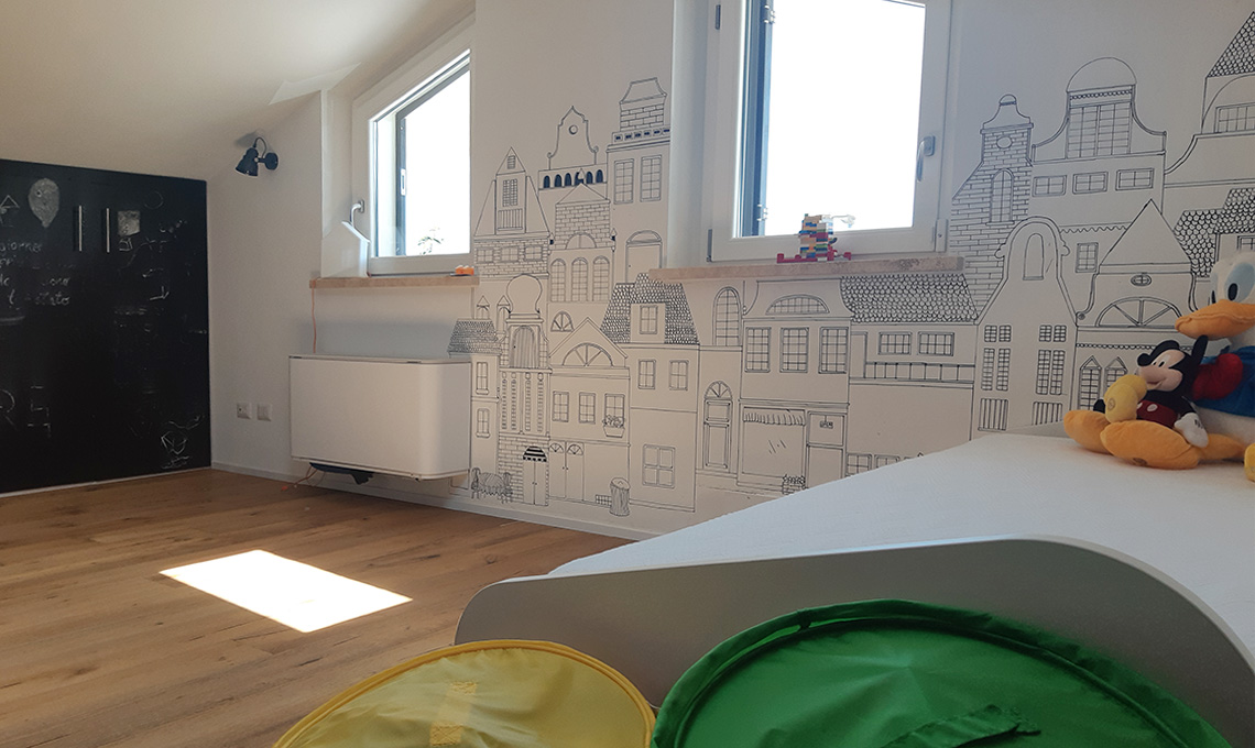Al piano superiore si trovano le camere. Anche qui gli ambiente sono stati personalizzati con arredi di recupero e creatività: la carta da parati in camera da letto è stata realizzata da una foto d'autore mentre in camera dei bambini la decorazione a parete è un murales realizzato da Metusela ispirandosi alle case nordiche.