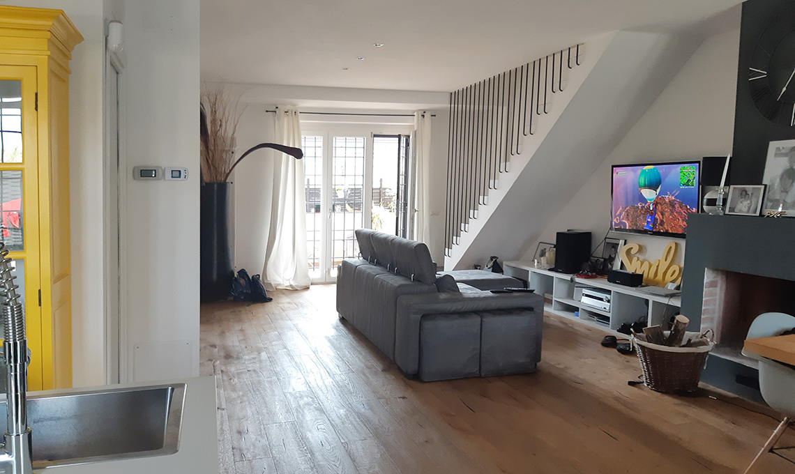 Per il pavimento hanno scelto per tutta la casa un parquet in legno caldo, color miele, con venature nere. "In inverno con il riscaldamento a pavimento è un piacere camminare scalzi!".