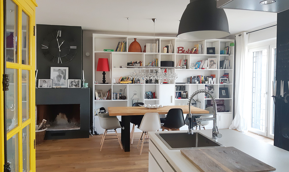 Il grande open space è l’ambiente più vissuto della casa. Qui si affaccia la cucina a vista, la zona pranzo impreziosita e sottolineata dal lampadario in cristallo, il camino che aggiunge carattere anche grazie al colore grigio scelto, la libreria a tutta parete e la zona relax con i divani.