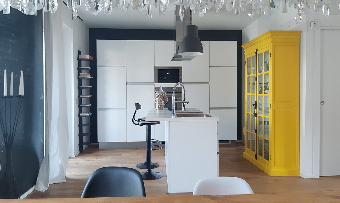 "Ad esempio in cucina abbiamo rinnovato la nostra vecchia vetrina bianca dipingendola di giallo, probabilmente non sarà una scelta definitiva! La nostra è una casa sempre in progress, ci piace rinnovarla cambiando colore ai mobili e modificando i rivestimenti dei tessuti.