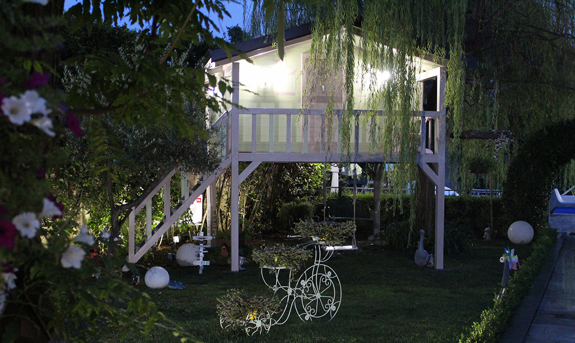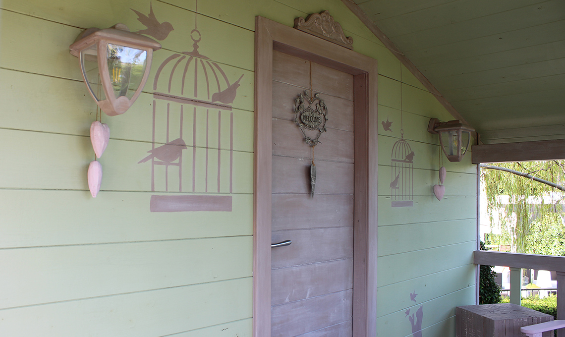 Per la casetta , che doveva avere anche un tocco fatato, si è pensato ad una diversa palette di colore cambiando la scelta iniziale del rosa. Qui spicca l'abbinamento del verde salvia che contrasta con il grigio tortora e che mette in risalto ancora di più la linea della casa.