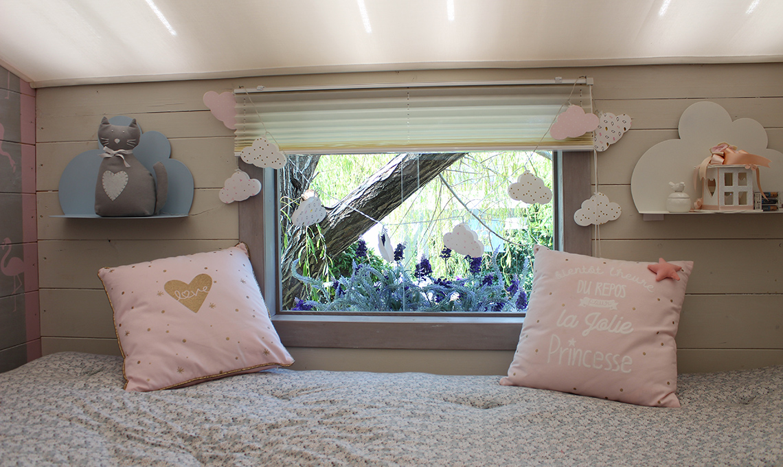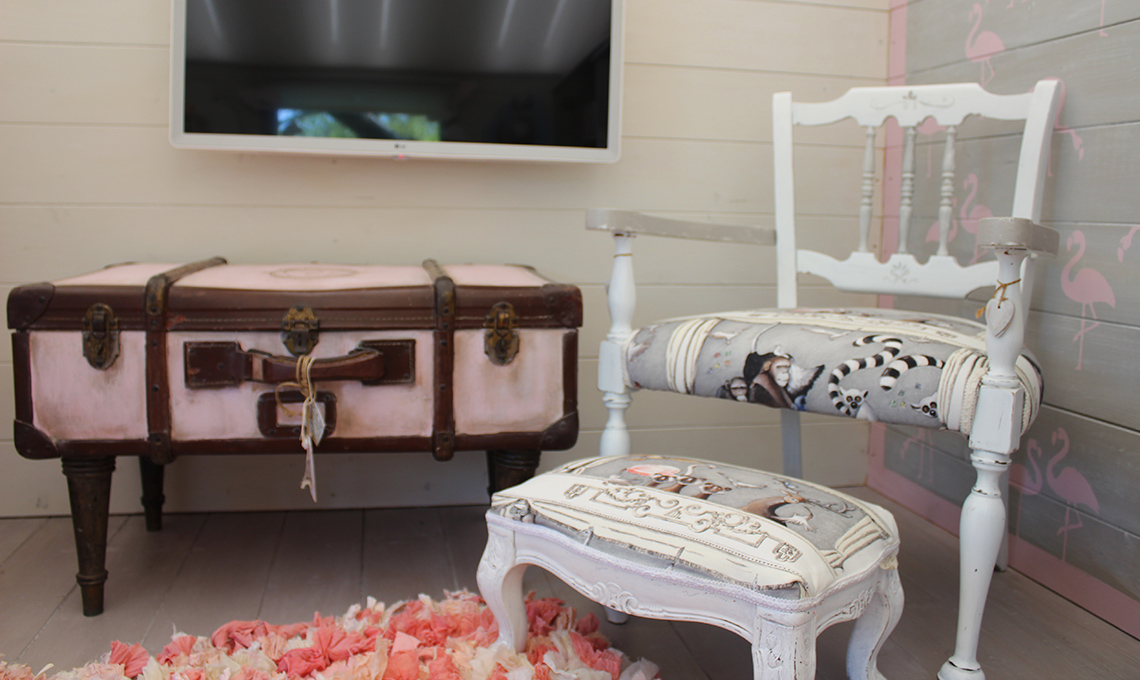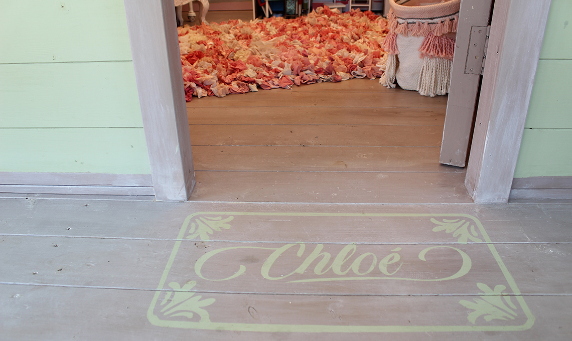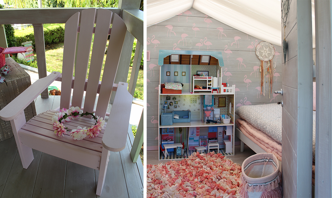 Per gli interni, parete grigio cenere con profili rosa, rallegrata da una flotta di fenicotteri e porzioni bianche per mettere in risalto i mobili. Tante decorazioni fatte con gli stencil, dettagli ricercati e accessori completano il progetto.