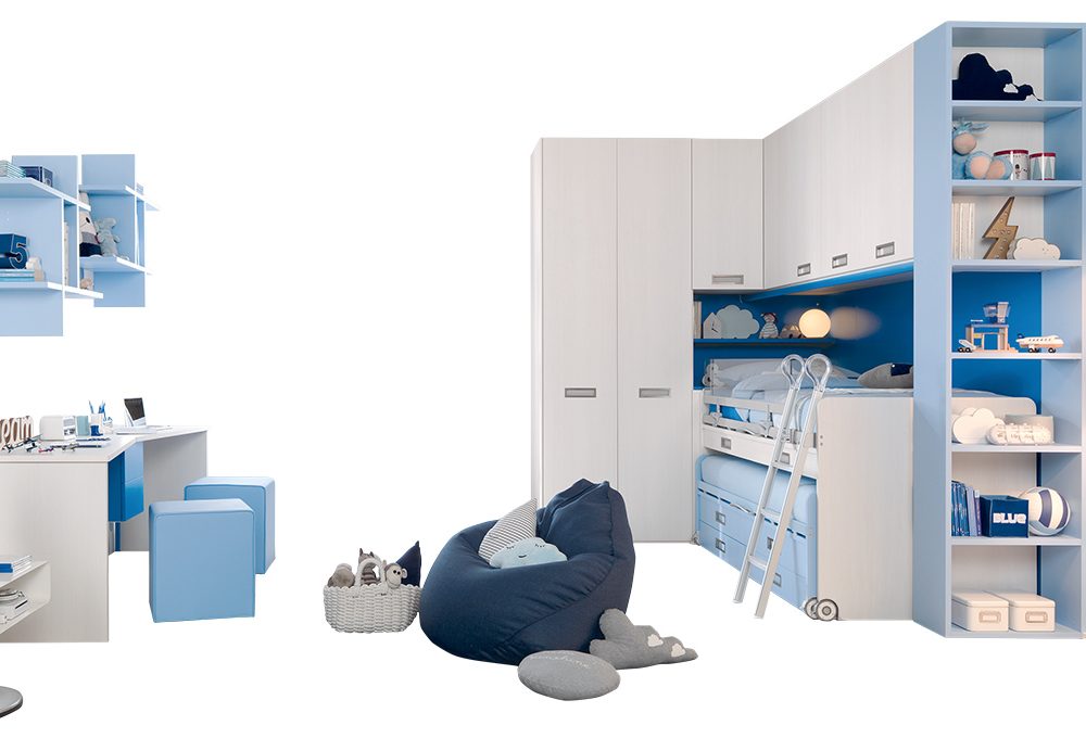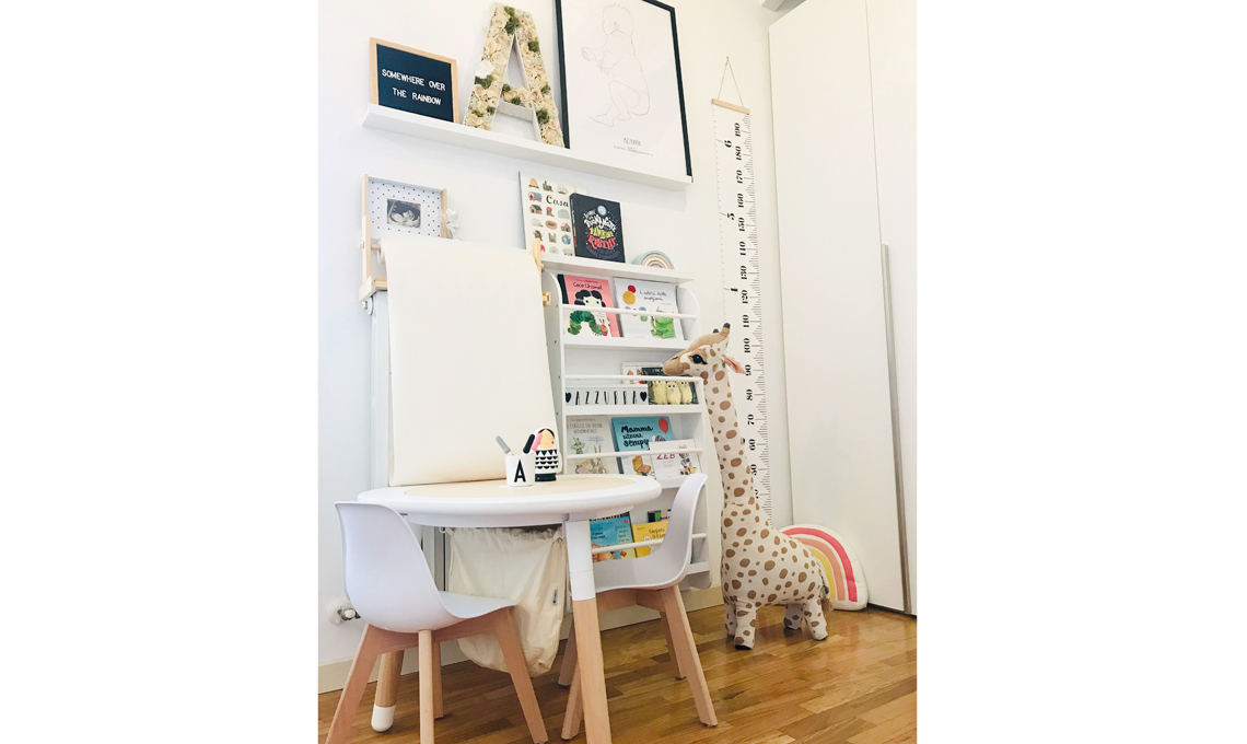 C'è anche una zona-creatività con il tavolo 'Mutable' [Mukako] con mini sedie con gambe in legno [CasaShop]. L'angolo lettura si completa con una libreria frontale Montessoriana e mensole poggia-libri così che Azzurra possa scegliere da sola il suo libro preferito e poi rimetterlo al suo posto in autonomia!
