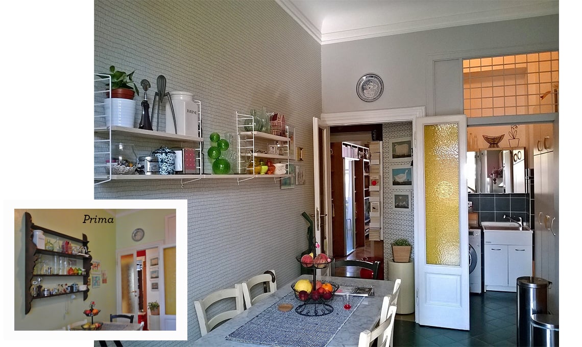 Abitare in affitto non significa rinunciare al piacere del décor. Ecco il relooking soft realizzato da una nostra lettrice, con colore, carta da parati, sedie-icona assortite e una mini libreria di design in cucina