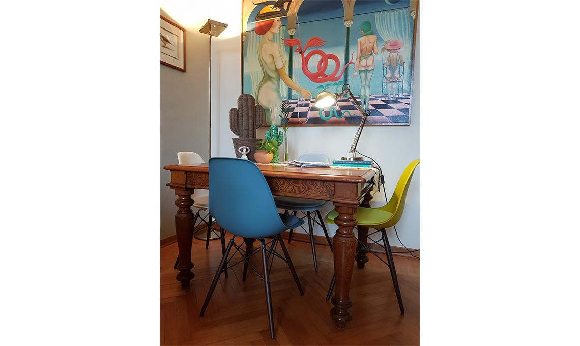 Mossa 3: nuove sedie intorno al tavolo d’epoca, le Eames Plastic side Chair di Charles e Ray Eames [Vitra] in quattro tonalità diverse (quelle col cuscino inserito).