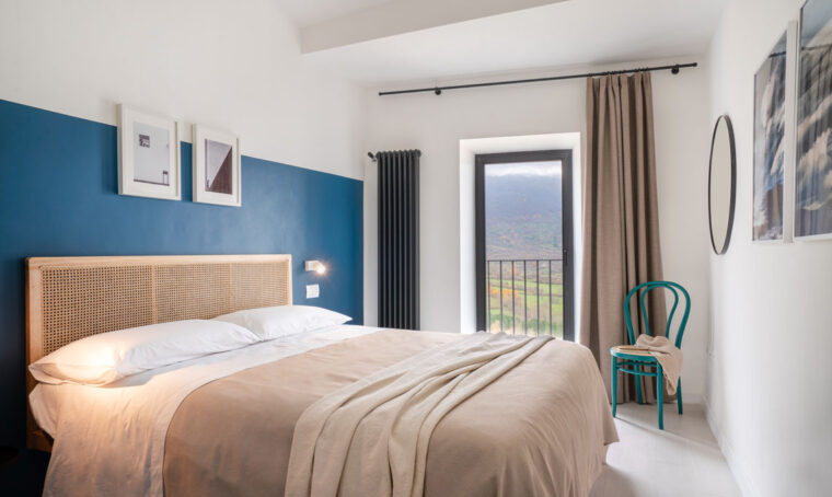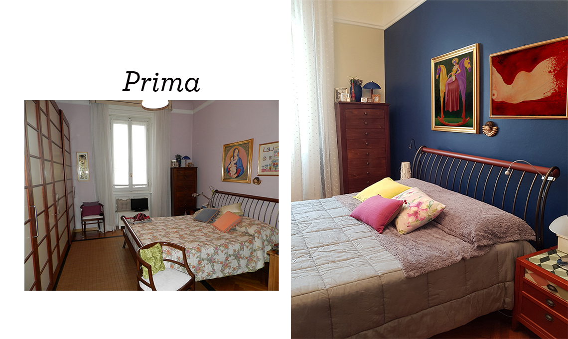 Per eliminare quel senso di vuoto che si percepiva in una camera da letto fin troppo grande, è bastato dare una mano di blu scuro alla parete dietro il letto: tutto si è “ricompattato” regalando un’atmosfera più intima.