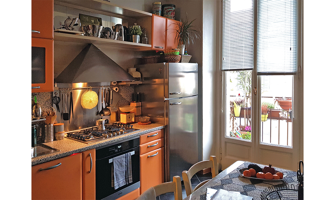 L'arancio della cucina, ora che la parete di fronte ha colori più chiari e uniformi (tolta la piattaia di legno, tinto il muro di un grigio tenue) risulta meno forte.