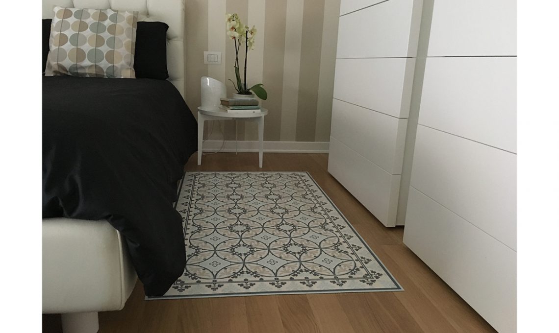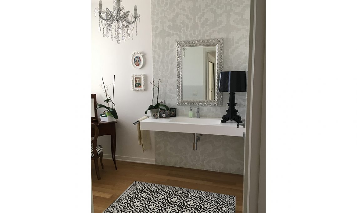 Vecchie pubblicità degli Anni '50 sono state incorniciate e appese in lavanderia. Sul pavimento di legno alcuni tappeti di vinile ricordano le cementine delle case delle nostre nonne.