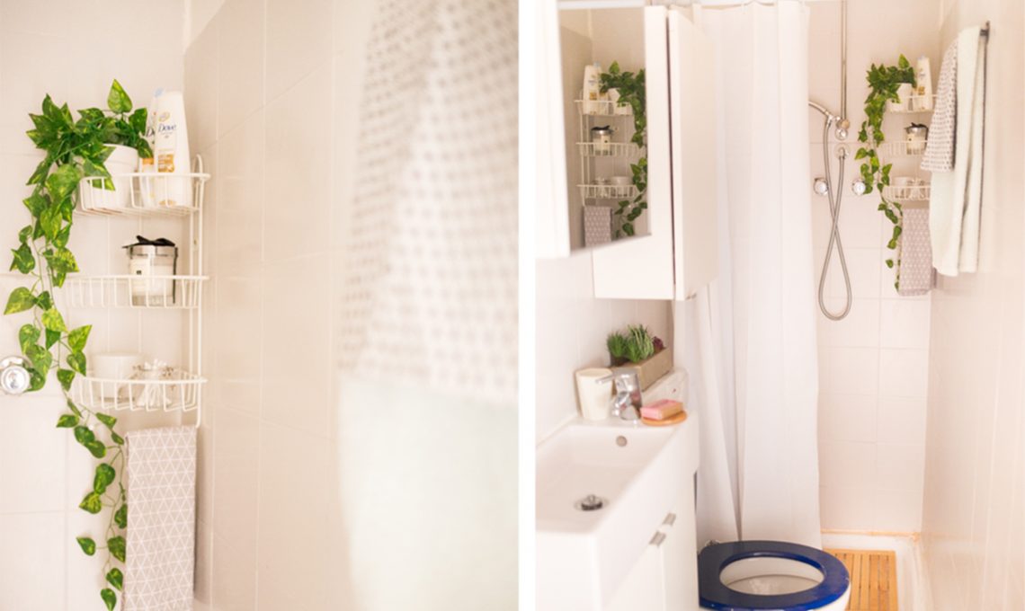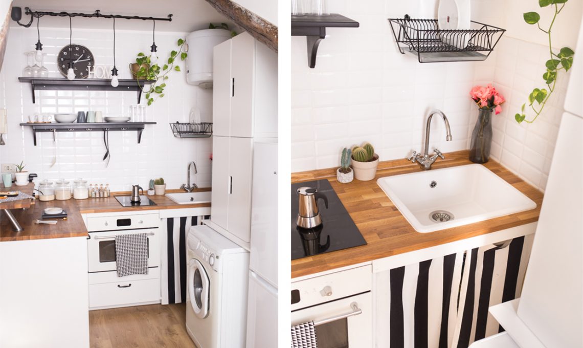 . Dato lo spazio ridottissimo, è buona l'idea di non mettere dei pensili in cucina ma di sostituirli con delle mensole. Riempirle, oltre che con gli accessori di cucina, con qualche piccola pianta aiuta a inglobarle nel soggiorno creando continuità tra lo spazio cucina e quello living.