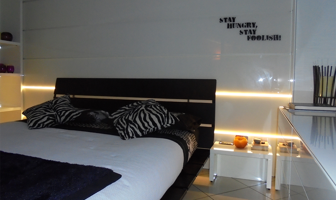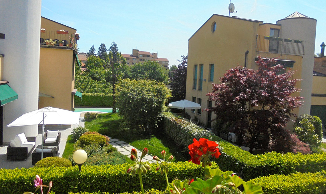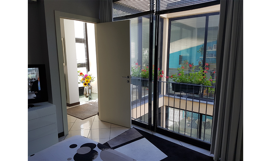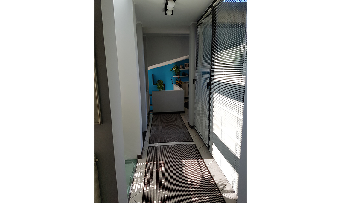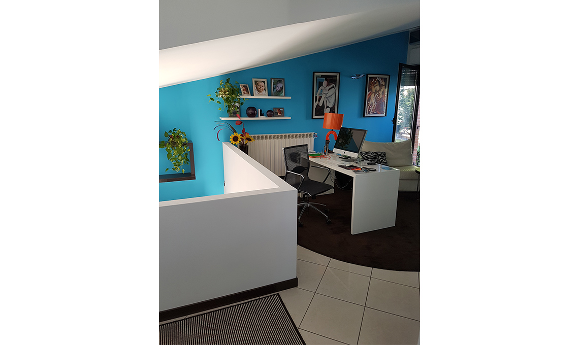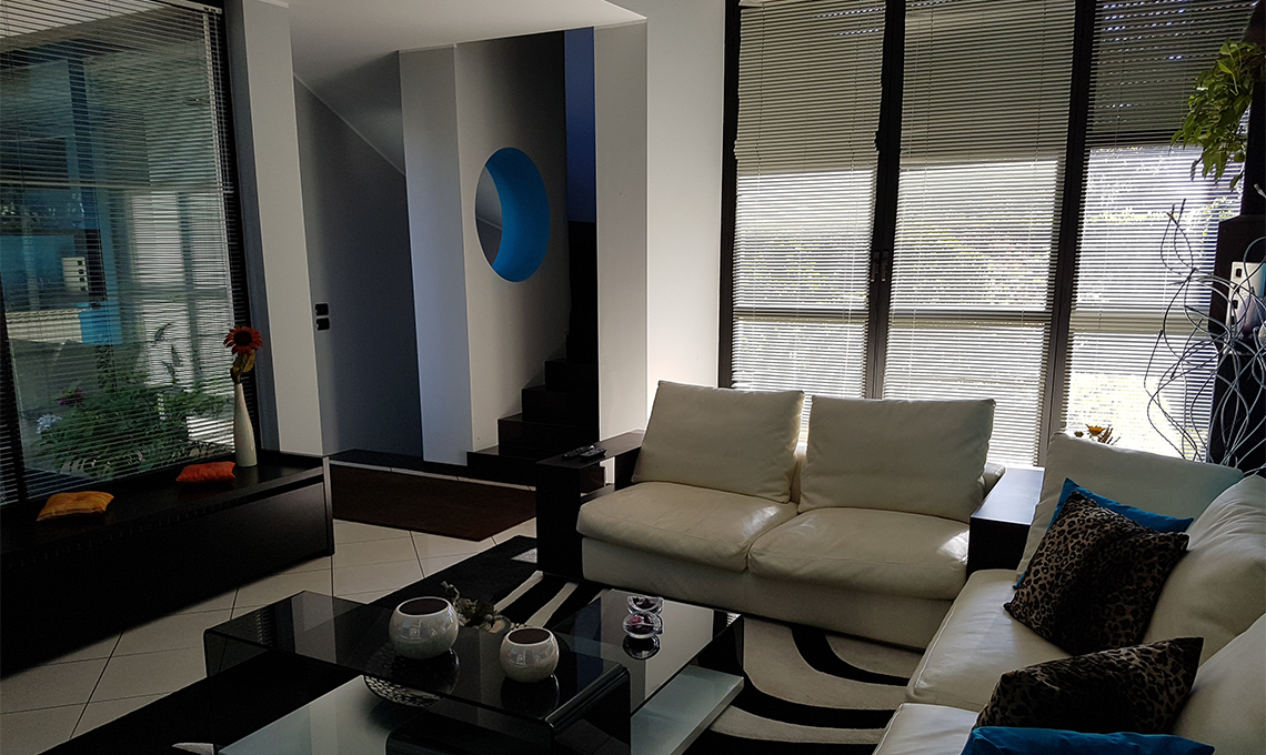 «La casa è disposta su tre piani più piano interrato. Al primo piano ci sono cucina, sala da pranzo e soggiorno. Al secondo piano, camera matrimoniale, studio, bagno, stireria. In mansarda si trova un'altra camera matrimoniale e un terrazzo. Il piano interrato è adibito a taverna, comprende un bagno, il locale caldaia e il garage. Si tratta di una struttura funzionale e ben organizzata per un totale di circa 250 mq. Ho acquistato questa casa nel 2000. Diverse cose mi sono piaciute, in particolare il cavedio circondato da grandi vetrate, la struttura al piano terra e al primo piano molto aperta (al piano terra non c'è neppure una porta) e il giardino di circa 400 mq che circonda tre lati della casa. A ciò si aggiunge il fatto che, a parte il mio lavoro, la mia più grande passione è la ristrutturazione di case e l' arredamento. Quando l'ho acquistata, la casa era stata appena costruita ed era allo stato grezzo. Con l'aiuto di un geometra, ho fornito lo spunto per modifiche interne al piano terra e al primo piano».