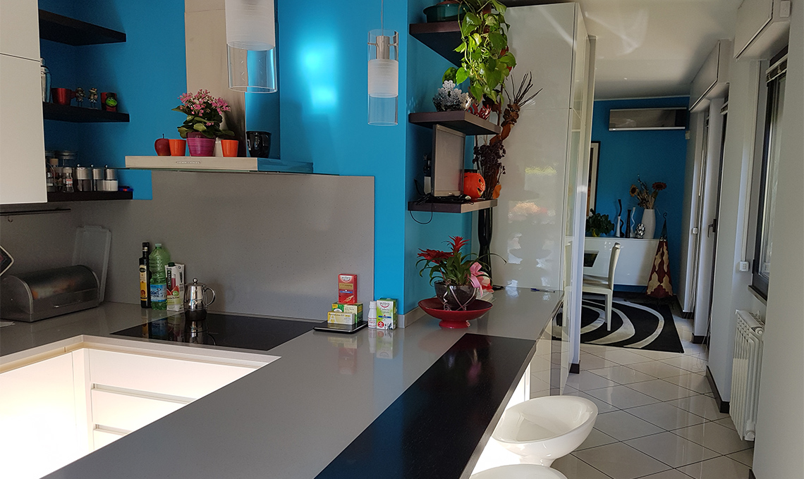 «I pavimenti risalgono a quando ho acquistato la casa, mentre l'arredamento che si vede nelle foto è stato aggiunto nel 2010», racconta Marinella, che ha puntato su arredi in bianco e nero dalle fogge che ricordano gli Anni '80. Per dare un tocco di colore e unificare lo stile della casa, ha scelto un intenso azzurro ciano con cui ha dipinti alcune pareti. Questa villa moderna è molto luminosa, grazie alle ampie finestre che dialogano con il giardino e con il resto del complesso residenziale. «Nonostante siano ormai passati 17 anni, amo la mia casa come il primo giorno in cui ci sono entrata!».