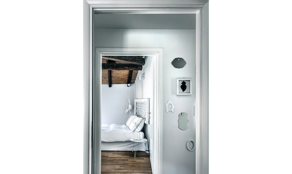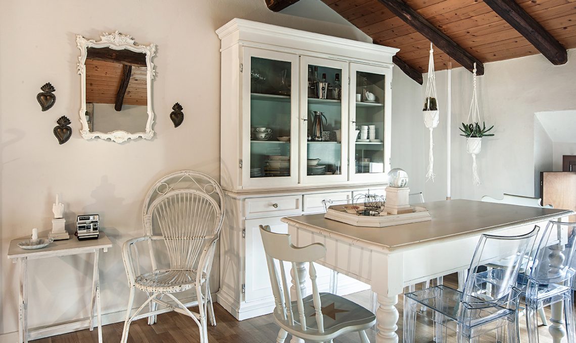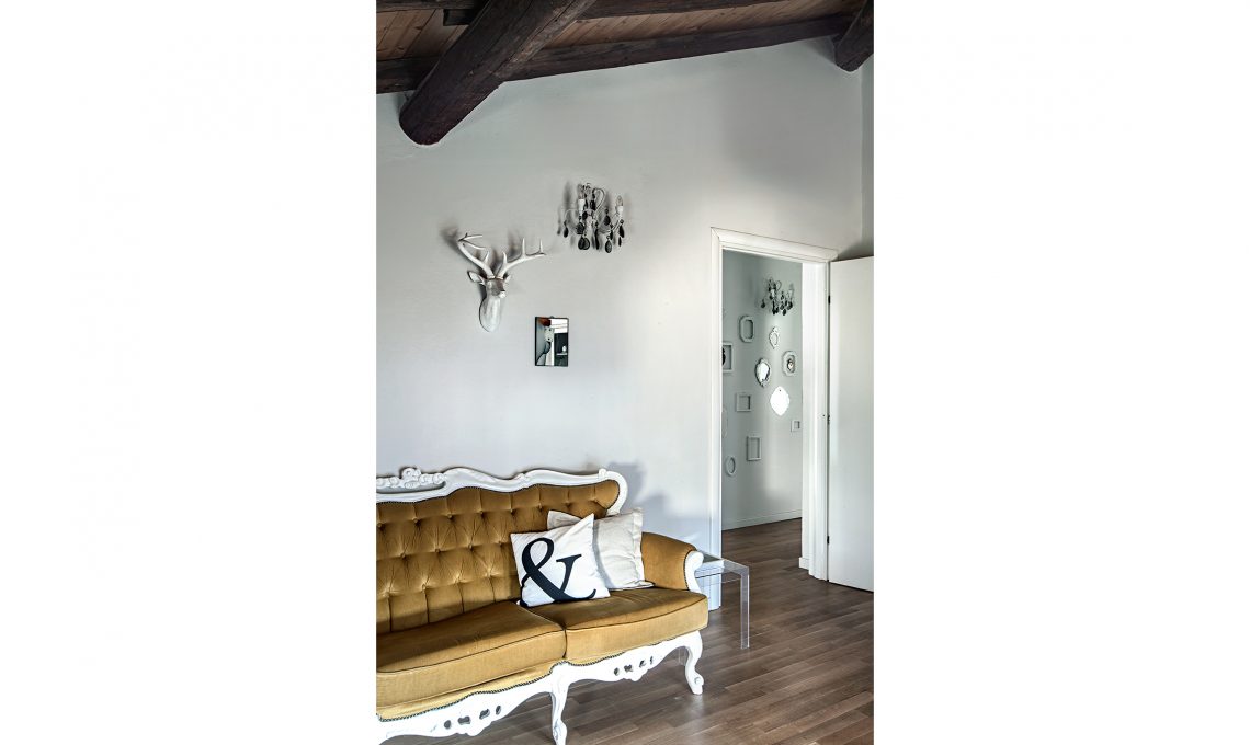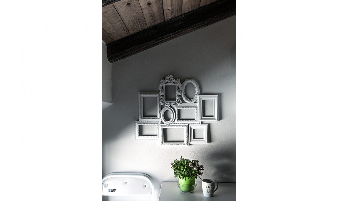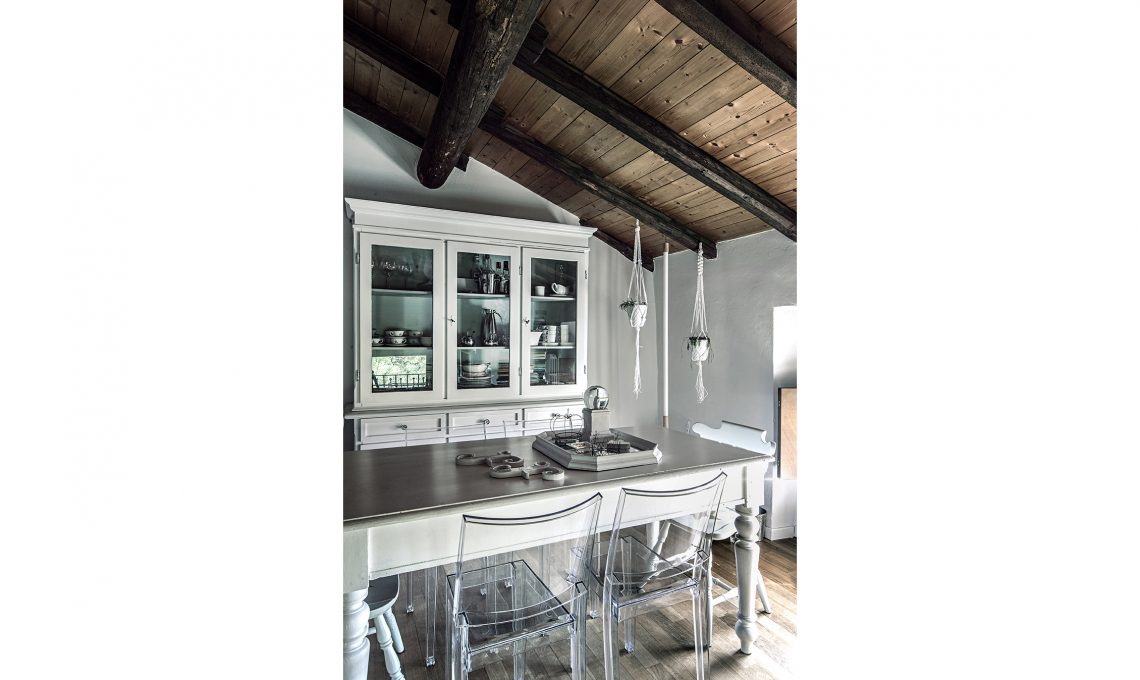 Pistacchio & Caffè, in cui offre anche consulenze di progettazione, in particolare mirate alla scelta e all'uso dei colori. Dice di amare tutte le sfumature, ma per casa sua ha scelto il "total white" «Perché – dice – lo trovo più rilassante e mi aiuta a recuperare uno sguardo 'neutro' per il lavoro del giorno dopo». Bianco come necessità, quindi. E anche come scelta stilistica: il candore, qui, è una base su cui lavorare aggiungendo pezzi di origini e stili diversi, dalla poltrona rococò alla lampada design di Seletti. Il bianco stesso assume forme diverse: nel tavolo provenzale e nella credenza in sala da pranzo, nel midollino della poltroncina in&outdoor, nelle cornice moderne e barocche...