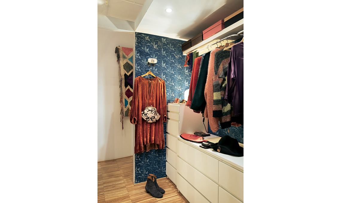 È decorato con un tappeto-arazzo marocchino multicolore e porta al bagno padronale e alla cabina armadio, organizzata con cassettiere e appenderia.