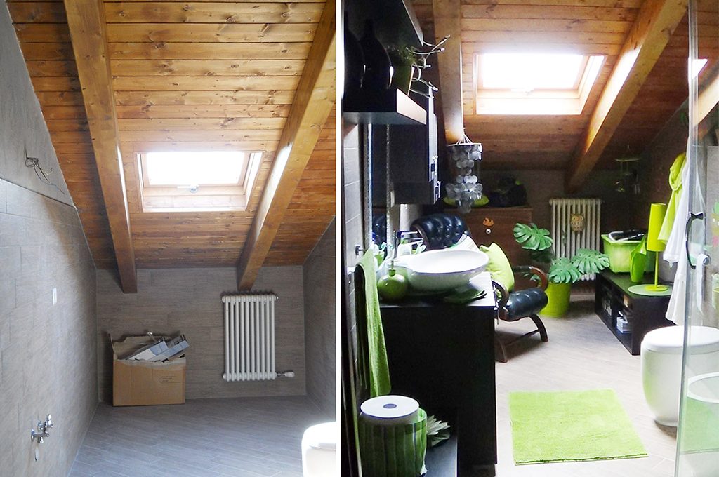 bagno: piastrelle grigie esaltate dai tocchi di verde. Il bagno si trasforma in una